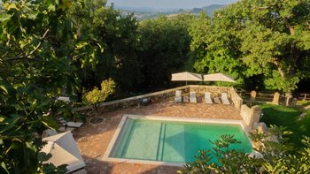 Draußen befindet sich ein herrlicher und privater beheizter Pool mit einer Reihe von klassischen weißen Sonnenliegen, wo Sie sich unter der heißen toskanischen Sonne bei einem heimlichen Glas toskanischen Weins inmitten von grünen Feldern entspannen können.