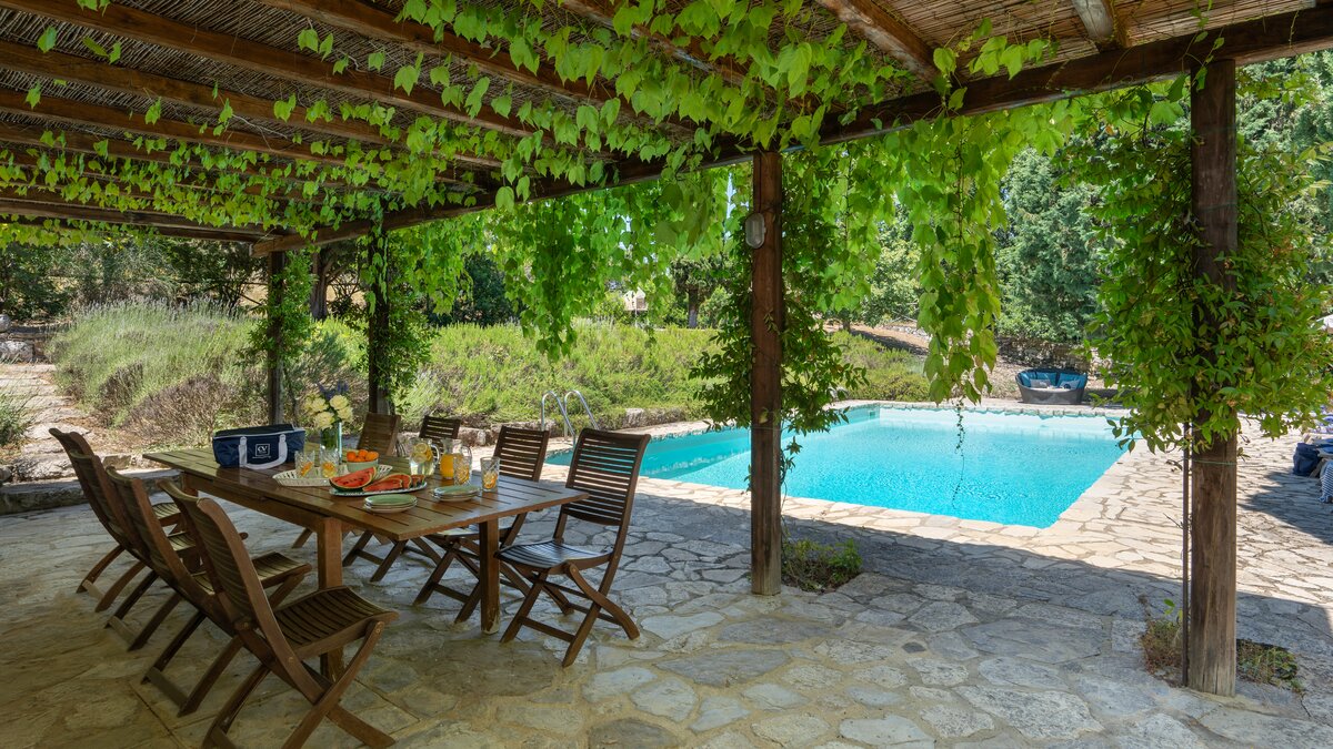 • Pool-Pergola möbliert zum Essen mit Vorbereitungsbereich