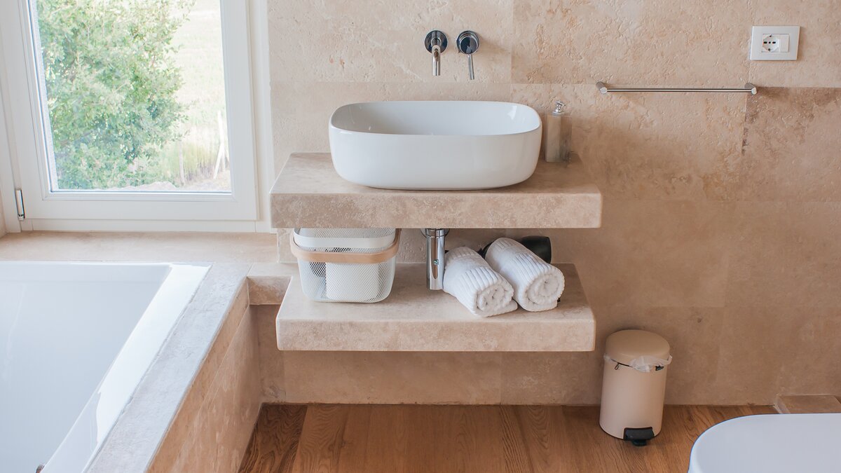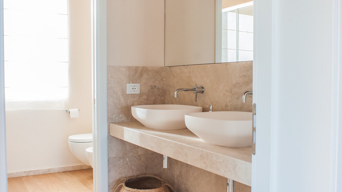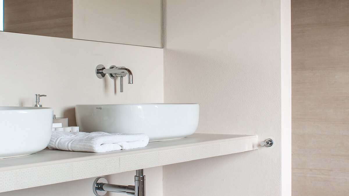 • Master-Doppelzimmer (King-Size) mit Zugang zur Terrasse mit Sitzbereich und Außendusche mit warmer und kalter Dusche und Duschbad mit zwei Waschbecken