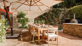 Im Außenbereich können die Gäste den beheizten Privater Pool, einen Sitzbalkon mit Panoramablick, einen Außenbereich mit Grill und Pizzaofen und die herrlich gepflegten Gärten nutzen.