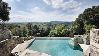 Betreten Sie die Villa durch das elegante offene Grundriss Wohnzimmer, den Essbereich und die voll ausgestattete Küche und genießen Sie das natürliche Licht, das anmutig von Raum zu Raum fließt. Denen beiden großen Hauptschlafzimmer, beide mit eigenem Bad, wurden sorgfältig entworfen, um allen Gästen jederzeit einen ruhigen und komfortablen Aufenthalt zu gewährleisten. Draußen bietet die teilweise überdachte Terrasse einen unvergleichlichen Blick auf die sanften Hügel der Toskana und ist ein idyllischer Ort, an dem die Gäste morgens, mittags oder abends vor einer beeindruckenden Kulisse speisen können. Stufen führen hinunter zum großen Infinity-Pool.