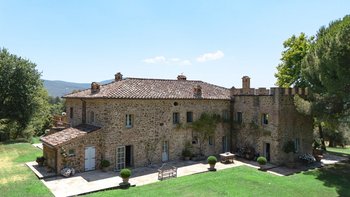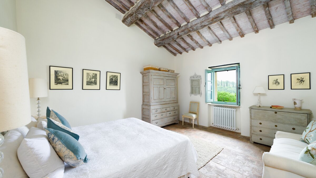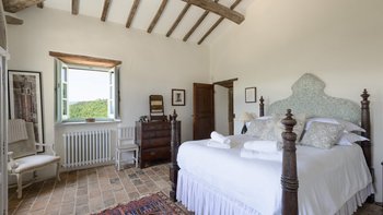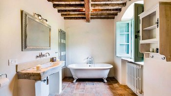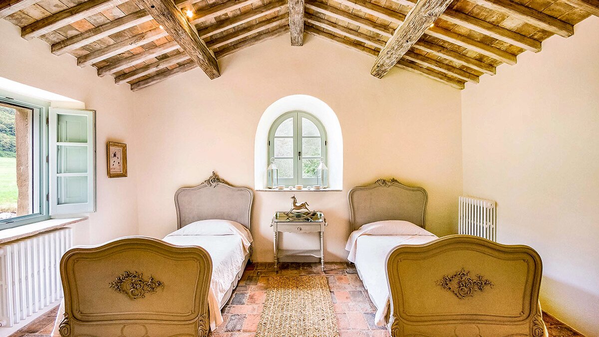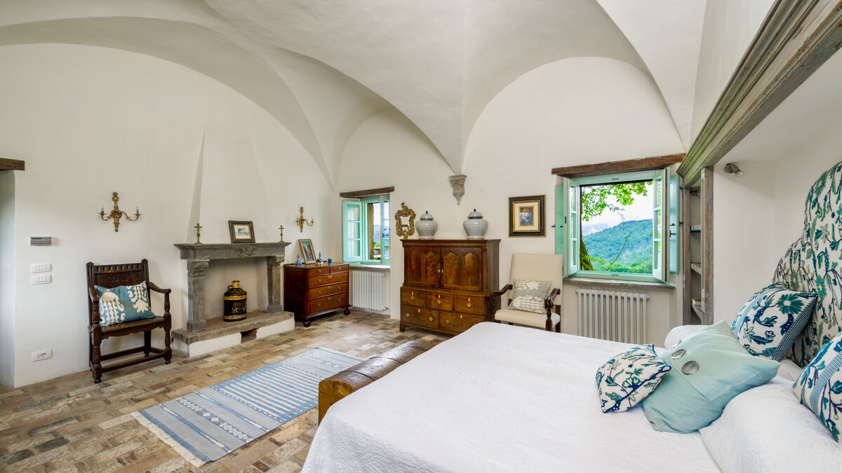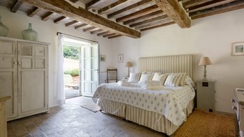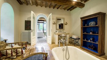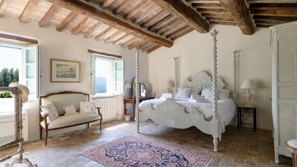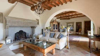 In den Hügeln zwischen Cortona und Mercatale gelegen, befindet sich dieses imposante alte Herrenhaus in ruhiger Abgeschiedenheit und ist dennoch gut gelegen, um sowohl toskanische und auch umbrische Städte zu erkunden. Dessen wunderschön restaurierten Dachsparren, Eichendecken und Steinstürze der Villa stehen heute neben modernen Geräten, modernem Komfort und faszinierenden Artefakten in mit schlichter Eleganz eingerichteten Zimmern. Im Herzen des Hauses befindet sich ein charmanter Salon in frischem Blau und Weißen, ergänzt durch einen gemütlichen Fernsehraum, ein Arbeitszimmer im ersten Stock und ein Wohnzimmer mit Galerie. Das Maniero di Sorbello besticht durch seine Innenausstattung mit Stoffen aus Chelsea Textiles, Percheron und Claremonte sowie Möbeln aus aller Welt. Es ist reich an Kultur, italienischen Elementen, einem gustavianischen Bücherregal aus dem 18. Jahrhundert und römischen Antiquitäten.