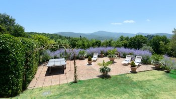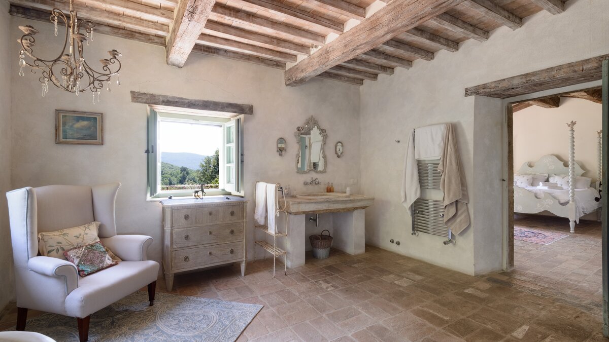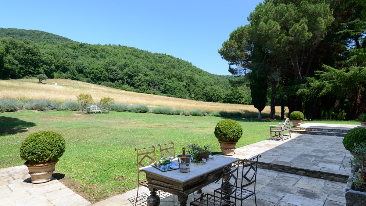 Die Schlafzimmer sind romantisch und individuell gestaltet, mit Himmelbildern und antiken Stücken, während die Badezimmer mit großen, ebenerdigen Duschen und freistehenden oder alten Marmorbädern ausgestattet sind. Dessen Haus bietet den perfekten Rahmen für das Leben im Innen- und Außenbereich und verfügt über eine wunderschöne Loggia zum Sitzen und Essen im Freien. Und in den Gärten führt ein Weg durch Pergola-Bögen zum Infinity-Pool und zum eindrucksvollen Pavillon am Pool. Ein Brunnen oben auf der Wiese stand einst in einem Kloster in Frankreich, ebenso wie der herrliche Torbogen in der Nähe des Swimmingpools. Eingebettet in eine große Privatsphäre, liegt die Villa in der Nähe des Castello di Reschio, das heute als eines der besten Resorts Mittelitaliens bekannt ist. Die Villa ist auch 8 km von den Geschäften und Restaurants in Mercatale und 12 km von Umbertide.