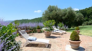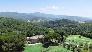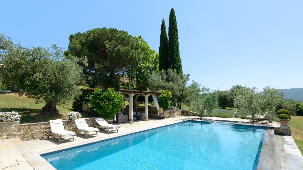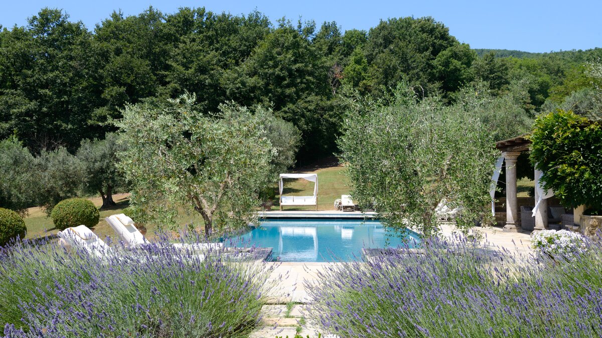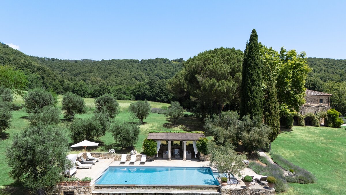 Mit einem privaten See, Wäldern und Olivenhainen und herrlichem Blick auf die weit entfernten Hügelschlösser ist diese Luxusvilla in der Toskana ein exquisiter Rückzugsort, der Ruhe und Raffinesse ausstrahlt.