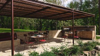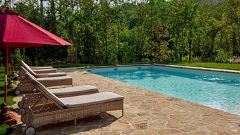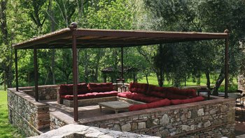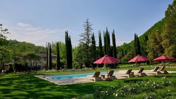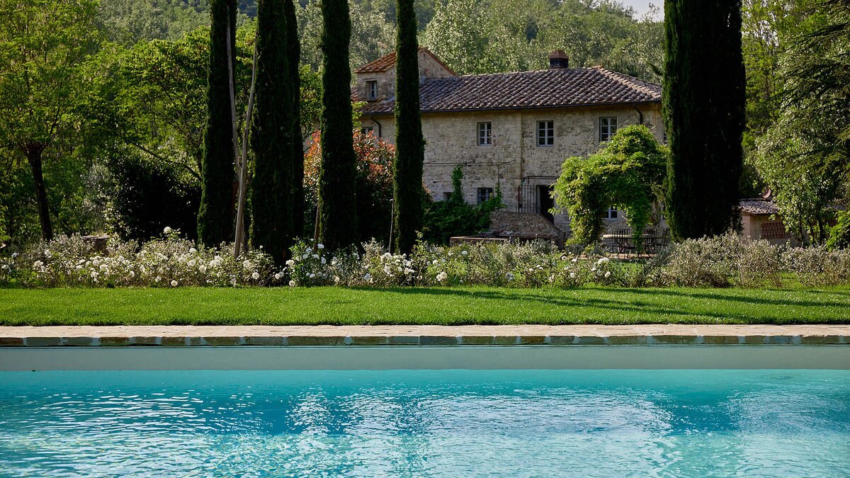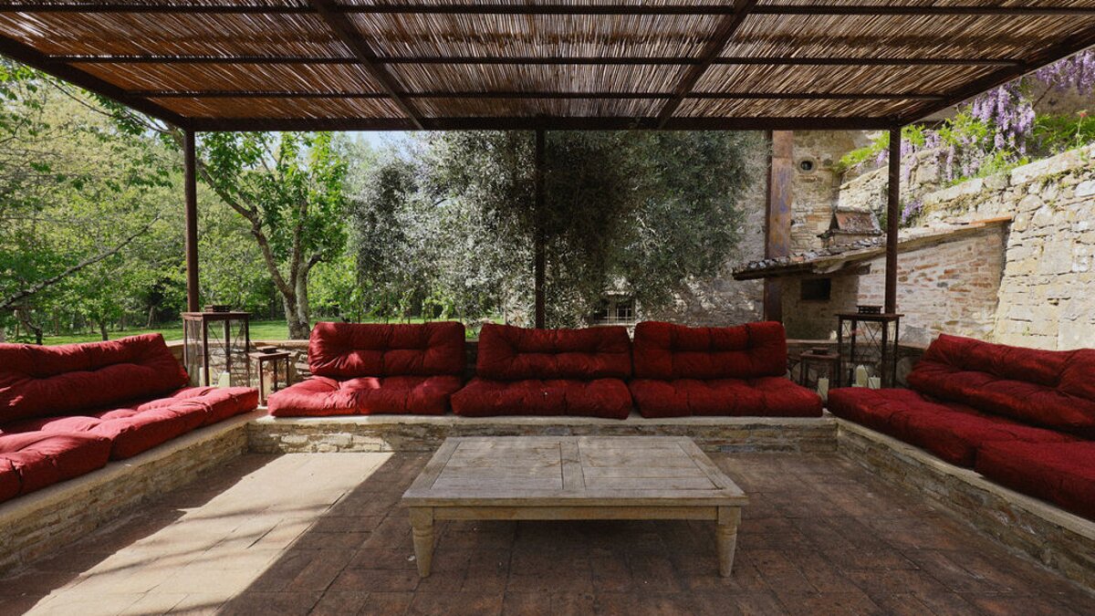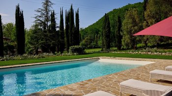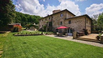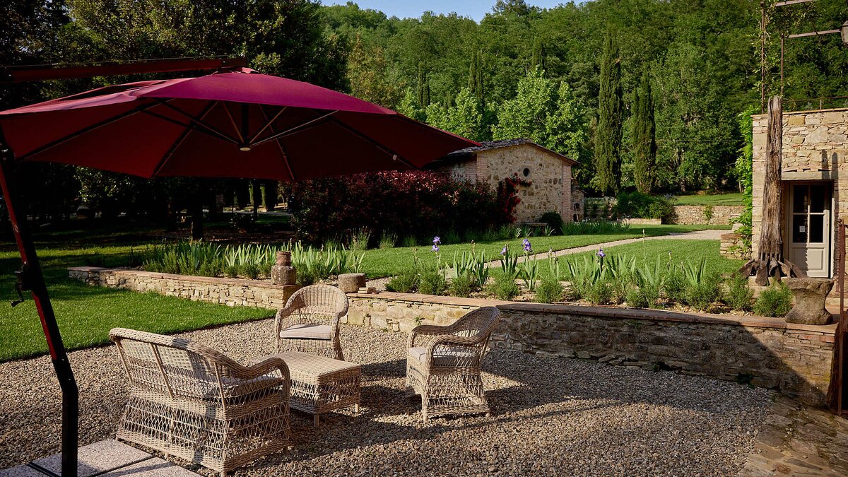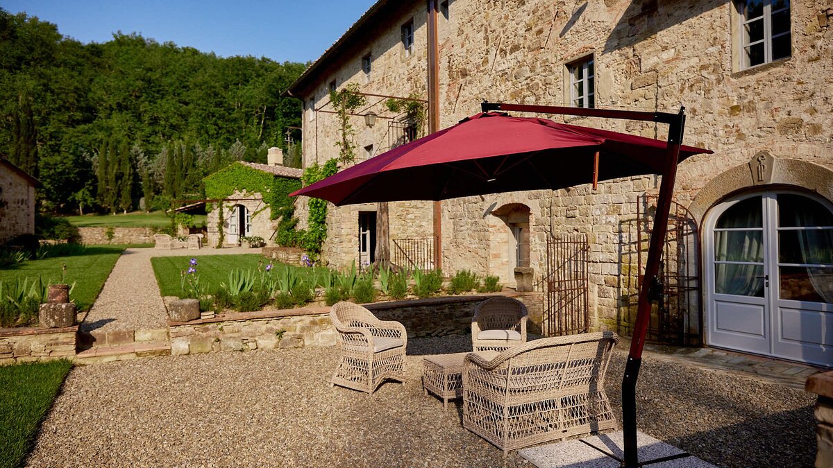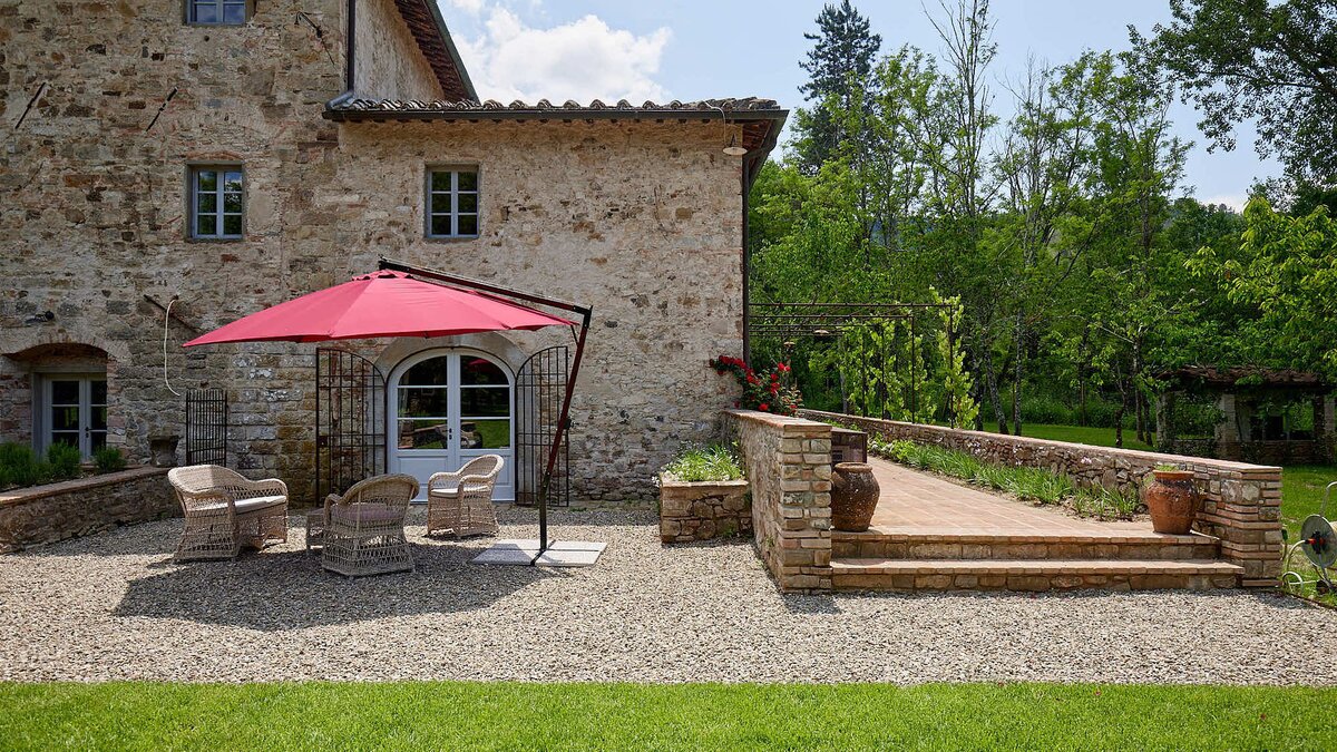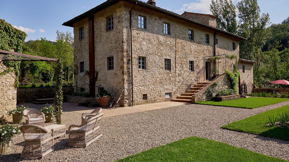 In den Loggien auf der Rückseite der Villa befinden sich die Wasserkanäle der Mühle, die zum Antrieb der Getreidemühlsteine verwendet werden, noch heute. Es gibt viele schattige und sonnenverwöhnte Plätze zum Essen und Entspannen, neben einem Swimmingpool auf dem Rasen mit schattiger Pergola mit Sitzgelegenheiten und Außenküche. Deren Rauschen des nahe gelegenen Flusses und die Kulissen und toskanischen Hügel tragen zur magischen und entspannenden Atmosphäre und Atmosphäre der Villa bei. Darüber hinaus gibt es einen privaten Bereich am Flussufer, wo die Gäste sich mit der Natur verbinden können, der mit einem Esstisch und Sonnenliegen ausgestattet ist. Deren Villa befindet sich in der Nähe von Florenz und bietet auch ein im Preis inbegriffenes Frühstück und einen Concierge-Service und.