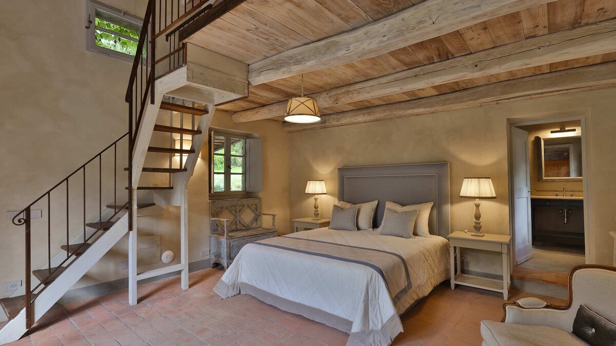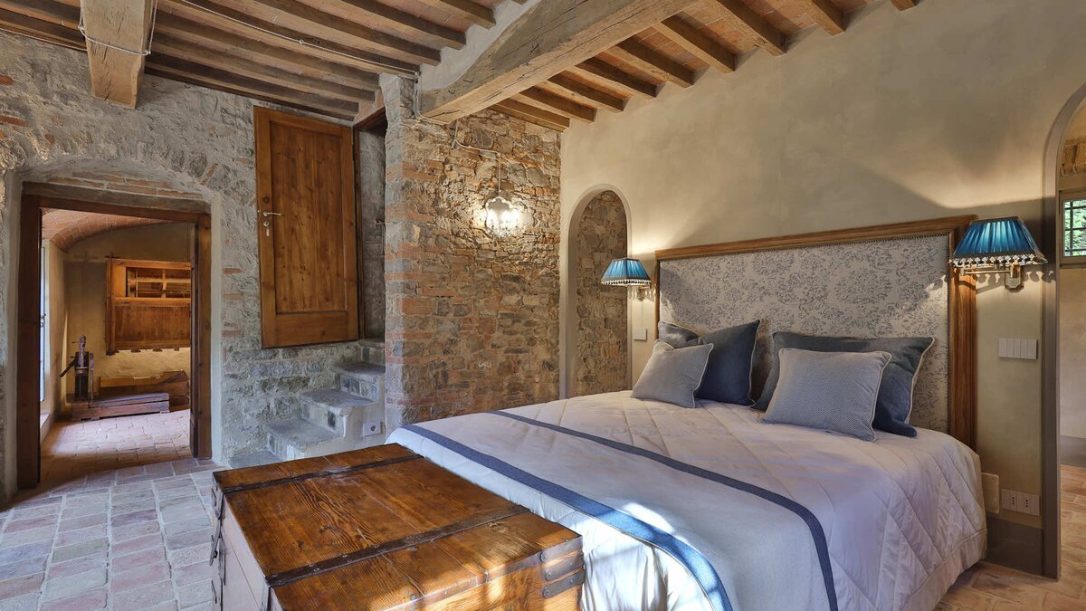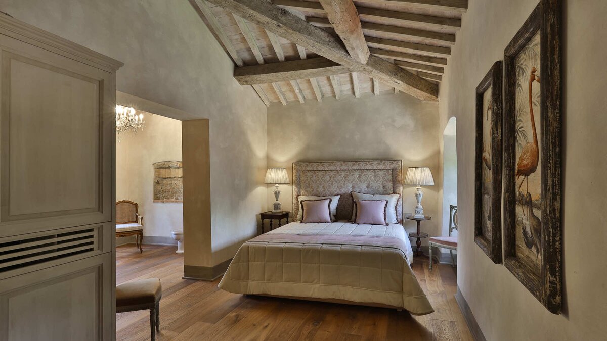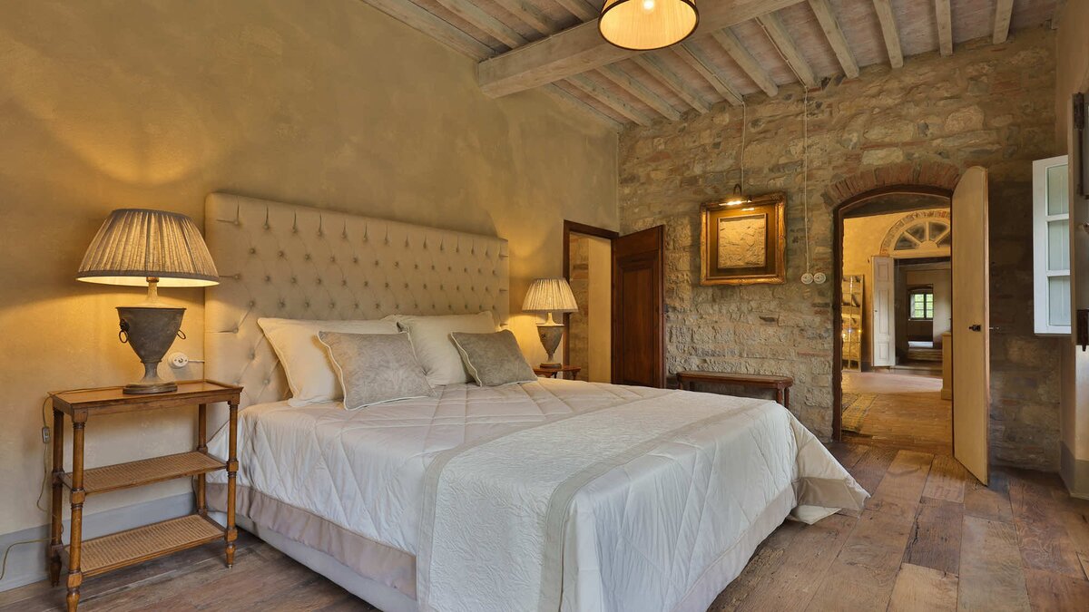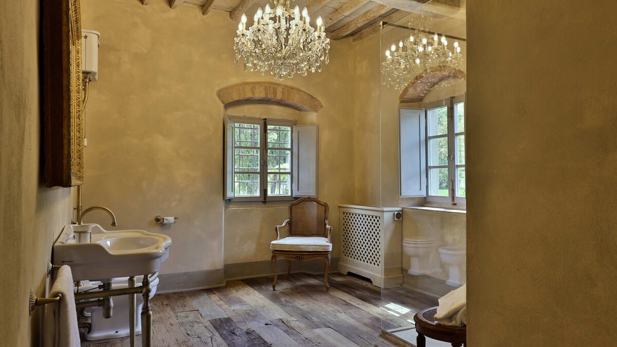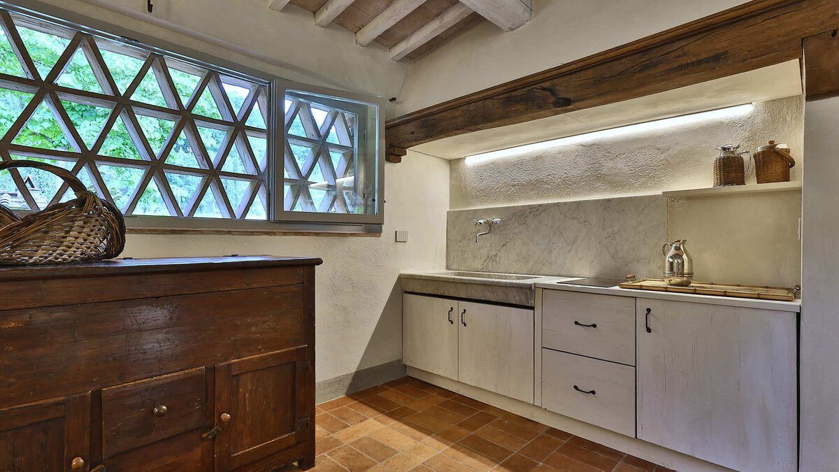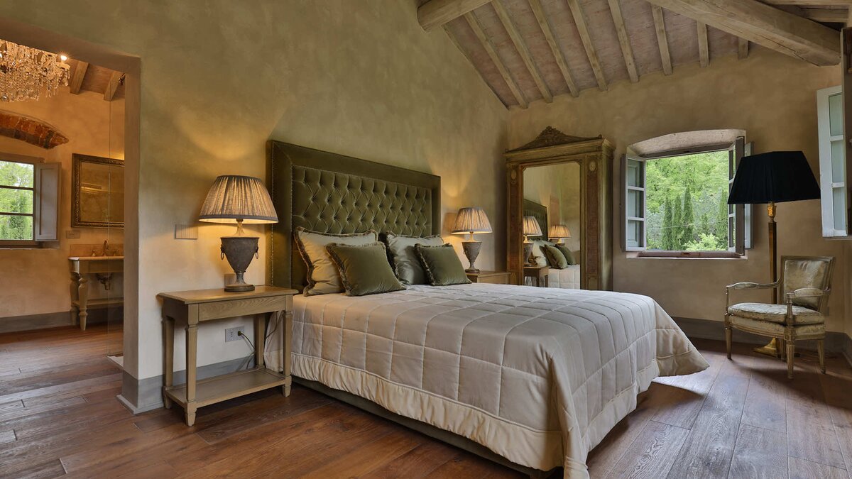 Tenuta del Vescovo ist ein wunderschönes historisches Haus, das mehr als tausend Jahre alt ist und ursprünglich als Getreide- und Weizenmühle erbaut wurde. Deren historische Landschaft rund um die Villa ist reich an üppigen Grüngesetzen, Olivenbäumen und Hanglagen. Im Inneren des Hauses befinden sich der Eingangsbereich, das Esszimmer und die Küche im Erdgeschoss, und es verfügt über sechs elegante Schlafzimmer. Deren erstes ist 'I Cipressi’, das Hauptschlafzimmer mit zeitlosen Grüntönen, die die lebhaften Zypressen im Garten widerspiegeln. Deren geräumige Bad zeichnet sich durch die Präsenz einer freistehenden Badewanne aus, von der aus die Gäste einen bezaubernden Blick bewundern können. 'Il Susino’ ist ein Schlafzimmer mit Doppelbett, das Charme und Eleganz ausstrahlt, mit freiliegenden Holzbalkendecken und Rosatönen, die von den Pflaumenbäumen im Garten inspiriert sind. 'La Camera Antica’ verfügt über einen Parkettboden, einen Kristallleuchter, ein eigenes Duschbad und ein luxuriöses und Super-Kingsize-Bett. 'Le Macine’ ist eine Doppelsuite in dem ehemaligen Stall der Villa mit direktem Gartenblick, einer überdachten Terrasse und einem Sitzbereich im Freien und Freien. Es grenzt an den Raum, in dem die Mühlsteine sorgfältig erhalten werden. 'Il Rosmarino’ befindet sich auf der linken Seite des Gebäudes und besteht aus einem Doppelzimmer im Erdgeschoss mit eigenem Bad sowie einem Zwischengeschoss mit zwei Einzelbetten. Dieses Zimmer öffnet sich auch zu einer Seitenterrasse mit einem Essbereich. ''Il Leccio’ ist das Gästehaus, das aus einem alten Sägewerk umgebaut wurde. Ins Innere besteht das Gästehaus aus einem Wohnzimmer mit Kamin, einer Küche mit einer historischen Marmorspüle und einem Hauptschlafzimmer mit offener Dusche.