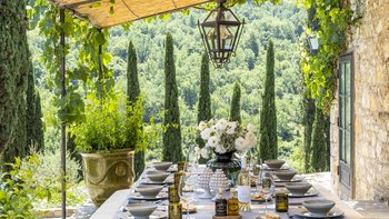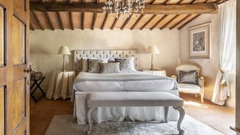 Diese Immobilie verfügt sowohl innen und auch außen über eine hohe Ausstattung. Deren wunderschöne Steinfassade ist traditionell klassisch und fügt sich perfekt in den abgerundeten, versunkenen Pool im hinteren Teil ein – es ist ein sofortiger Blickfang, der wunderschön mit gusseisernen Liegen und einer großzügigen, grauen Steinterrasse eingerahmt ist. Es gibt viel Platz für ein Sonnenbad oder eine Pause, sowie zwei große Terrassen mit Pergolen mit Travertin-Marmor-Tischen für ein gemütliches Frühstück, lange Mittagessen oder warmes Abendessen im Freien. Ins Innere ist die Villa sehr stilvoll, mit einer Eleganz, die rustikale Raffinesse schreit. Die geschliffenen cremefarbenen Wände der Alten Welt werden durch üppige Holzakzente ergänzt, seien es die schönen Balkendecken, dunklen Holzfensterscheiben oder die handgeschnitzten Möbel, die für das Anwesen maßgeschneidert sind. Es erwarten Sie antike Spiegel, florentinische handbemalte Schränke und handgeschmiedete Kronleuchterbeleuchtung in jedem Zimmer – es gibt auch schöne authentische Artefakte und Terrakotta-Fliesenböden, die dem Landhausdesign einen traditionellen Luxus verleihen. Deren Lounge ist wunderschön, mit Plüschsofas und einem großen Fernseher für maximalen Komfort, und es gibt eine maßgeschneiderte toskanische Küche, die einen herrlichen Rahmen für einen Aufenthalt in den Mahlzeiten bietet. Deren Villa verfügt über sieben Schlafzimmer – die Hauptvilla bietet Platz für 10 Personen, während weitere 4 im Kornspeicher am Pool untergebracht werden können. Alle Zimmer sind elegant in look and feel – luxuriöse Betten verbinden sich mit einem modernen Bad, das in traditionellem toskanischem Marmor eingerichtet ist.