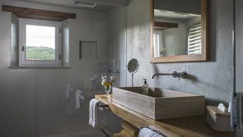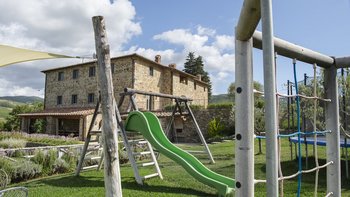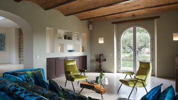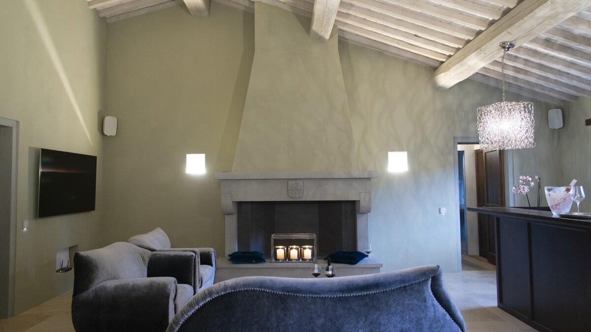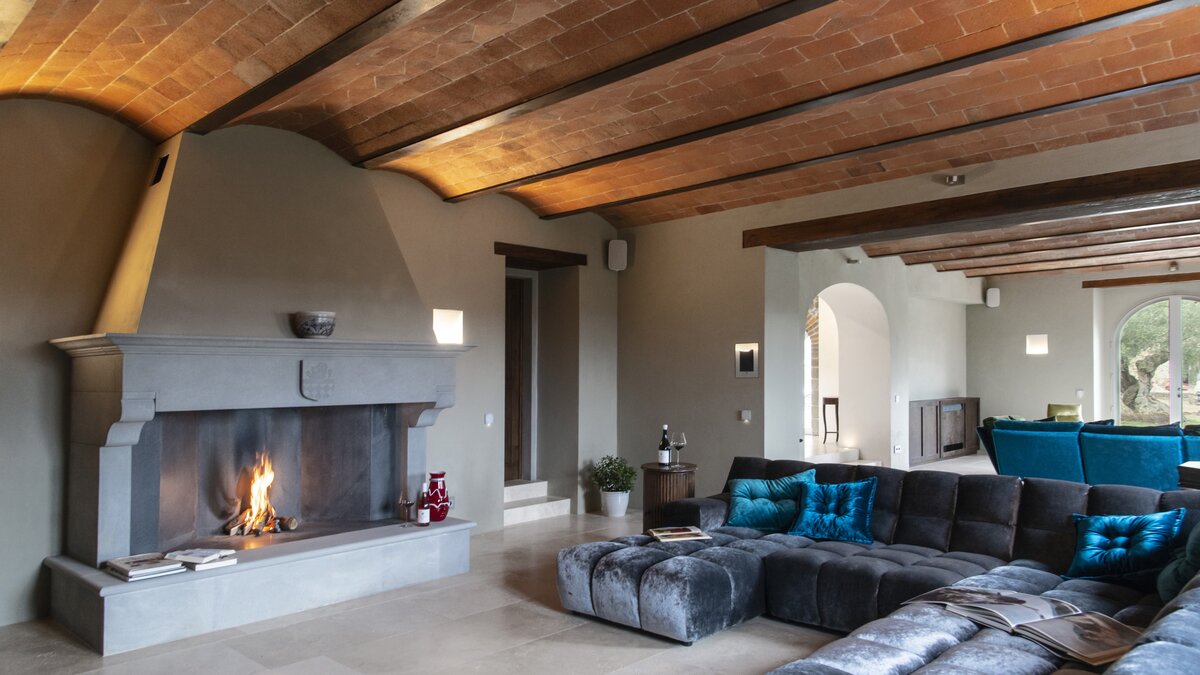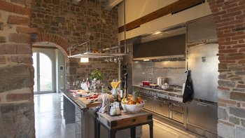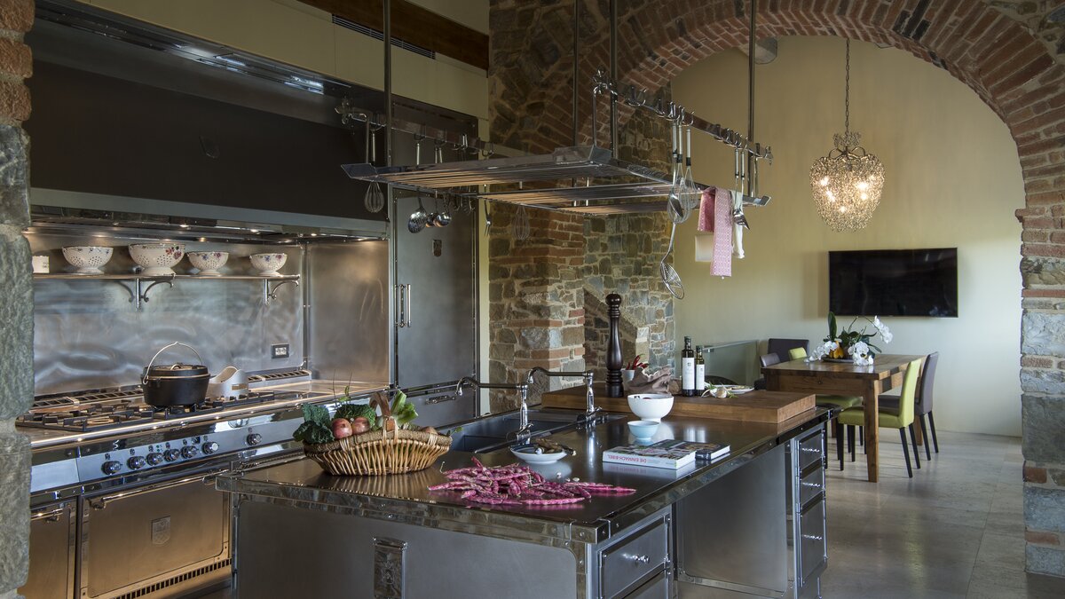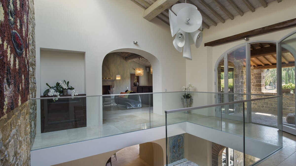 Die Villa Fieravista liegt auf dem Gelände einer preisgekrönten Wein- und Olivenölfarm und ist eine eklektische Mischung aus traditioneller Architektur mit Steinmauern und beeindruckenden Gewölbedecken und schickem, zeitgenössischem Stil. Des geräumigen Wohnzimmer ist mit einem weichen, luxuriösen Ecksofa und einem offenen Kamin mit einem separaten hellen offenen Essbereich, mit einem Tisch für 10 Personen und mit einem eigenen Pizzaofen der Villa ausgestattet. Es gibt eine fantastische Profiküche aus Edelstahl, die sich zu einer schönen Frühstücksterrasse mit atemberaubender Aussicht und einem Gemüsegarten öffnet, von dem die Gäste sich selbst bedienen können.