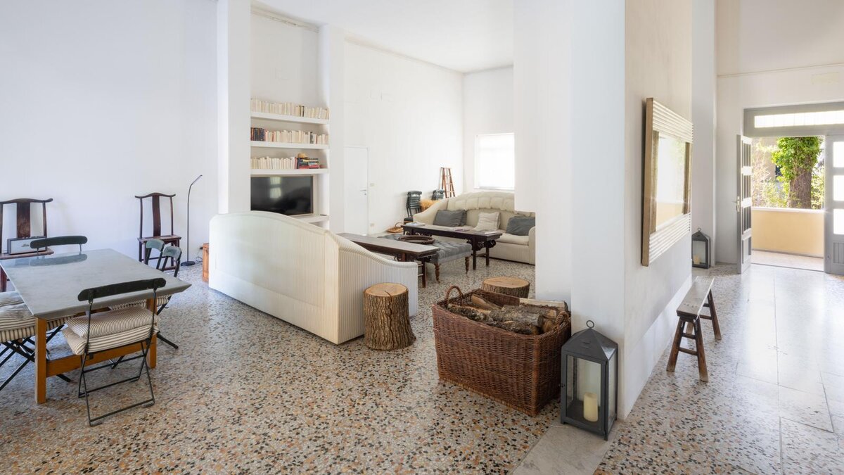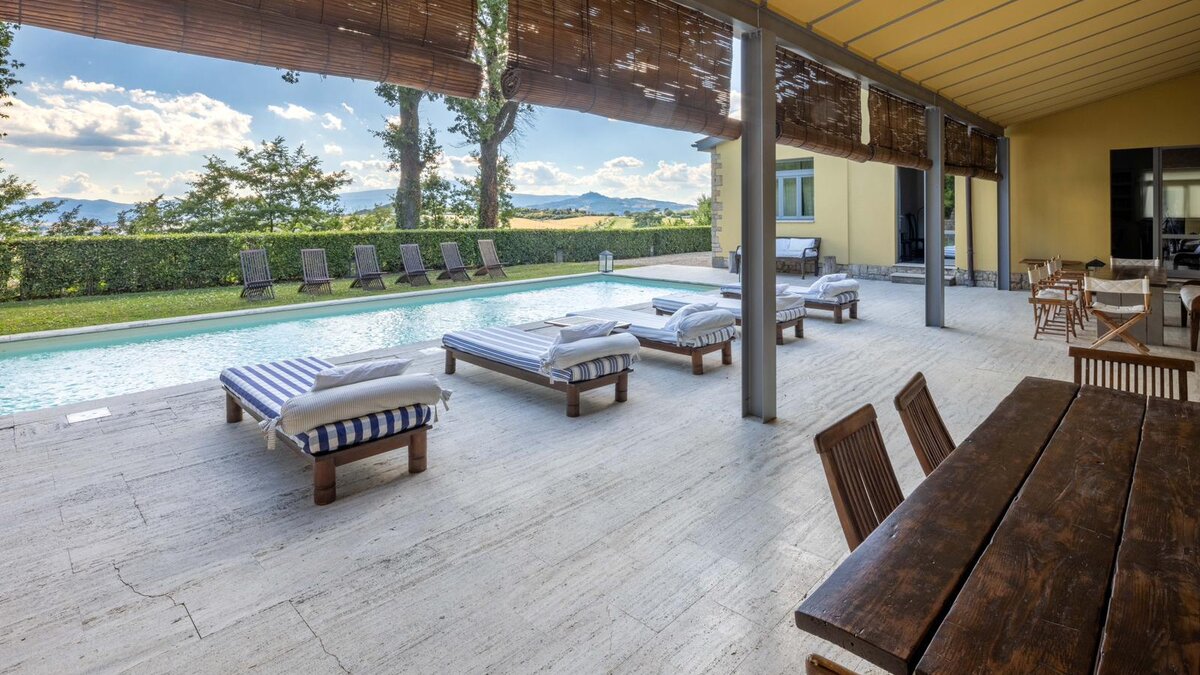 Im Außenbereich befindet sich der private 14 x 7 Meter große Pool, der von Liegestühlen und einer überdachten Veranda umgeben ist, die Schatten bietet.