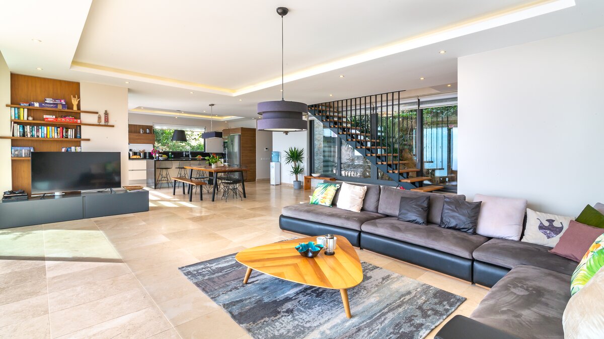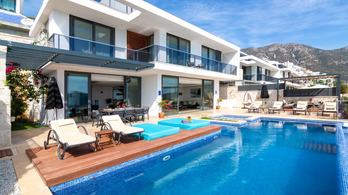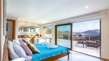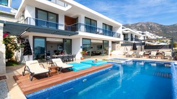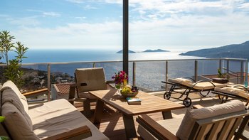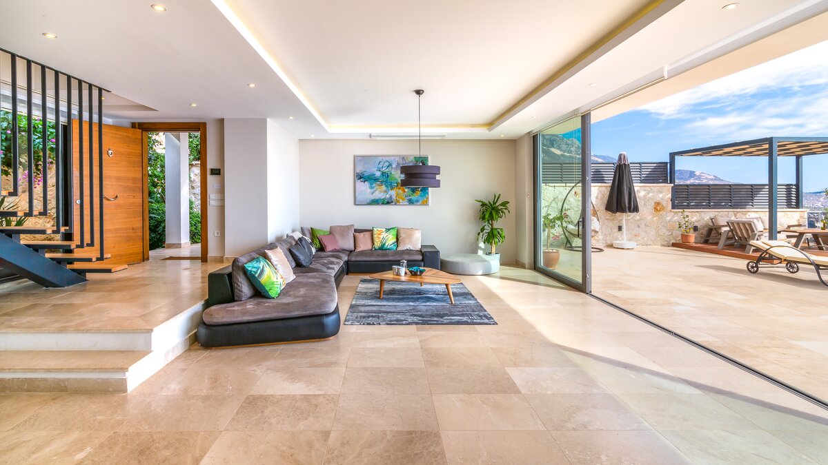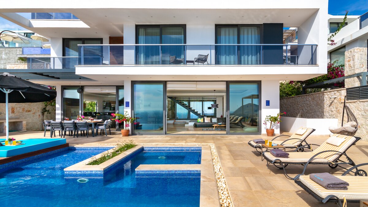 Im Freien können die Gäste warme Abende auf der Terrasse verbringen, die mit einem Essbereich im Freien, Privat Pool, Lounge-Bereich und Tagesbetten über dem Wasser ausgestattet ist. Deren Villa befindet sich nur 25 Minuten zu Fuß oder zwei Minuten mit dem Auto von Kalkan entfernt, wo es viele Restaurants, Geschäfte und Cafés gibt. Die Strandclubs Zest und Kalamar befinden sich beide weniger als 3 km entfernt.