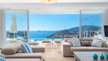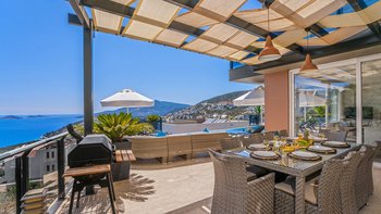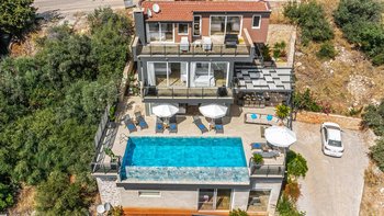 Die einladende und moderne Villa Daglari ist ideal für einen Familien- oder Gruppenaufenthalt in der Nähe des Zentrums von Kalkan, mit herrlichem Meerblick und einem Infinity-Pool.