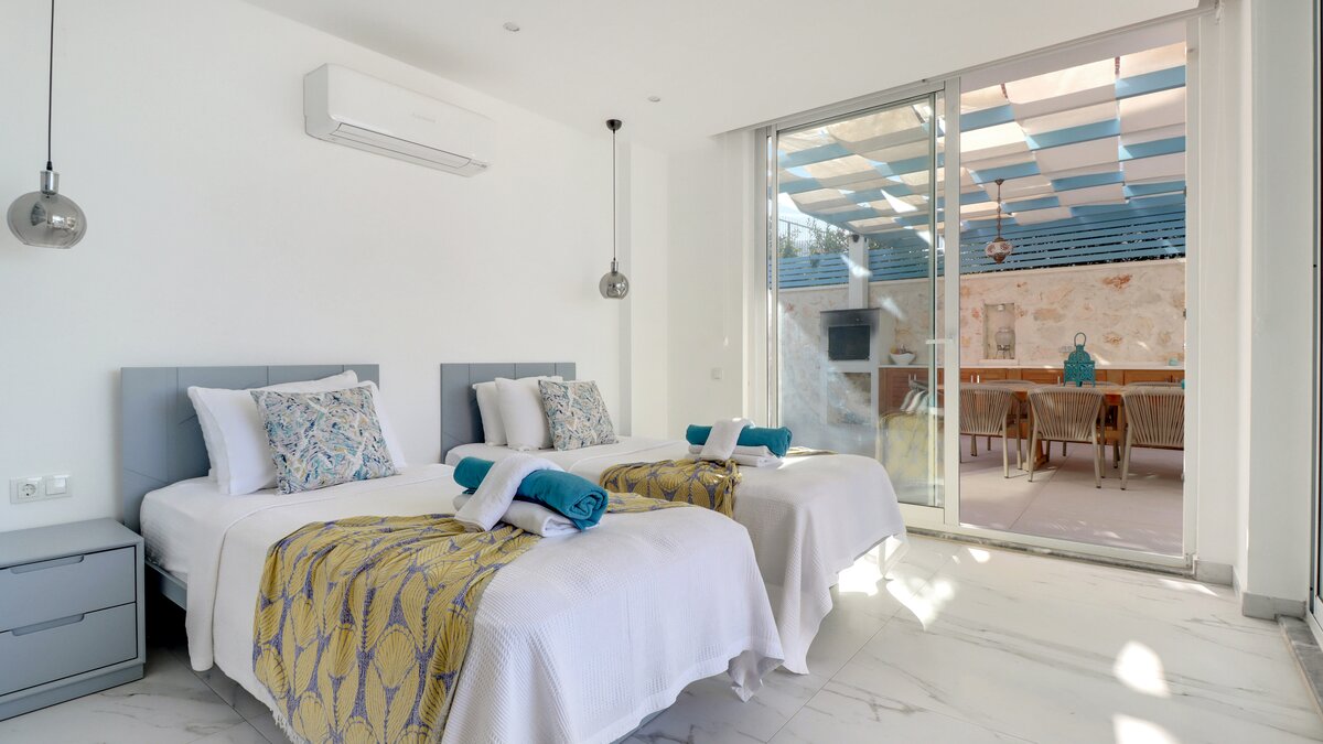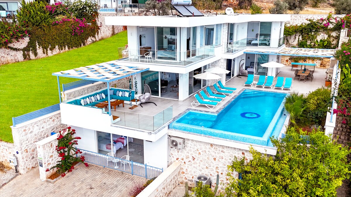 Die Villa Guler befindet sich in idealer Lage auf einem Hügel mit einer außergewöhnlichen Aussicht und nur 1 km vom charmanten Zentrum von Kalkan entfernt. Dessen Anwesen ist wunderschön mit frischen, weißen Interieurs in auffälligen Farben eingerichtet. Im Inneren finden die Gäste eine helle und luftige OFFENER GRUNDRISS Küche, ein Wohn- und Esszimmer vor. Im Erdgeschoss befindet sich auch ein Zweibettschlafzimmer, das auch als Doppelschlafzimmer mit Dusche en suite gestaltet werden kann. Ein weiteres Schlafzimmer mit eigenem Eingang, eine Küchenzeile, ein Ankleidezimmer und ein Badezimmer en suite befinden sich im unteren Erdgeschoss. Ideal für Gäste, die während des Aufenthalts in der Villa zusätzliche Privatsphäre benötigen. Im Obergeschoss erwarten Sie weitere freundliche und farbenfrohe Zimmer, darunter zwei Doppelschlafzimmer mit eigenem Bad mit Dusche und Zugang zu einem Gemeinschaftsbalkon und ein Hauptschlafzimmer (Kingsize) mit eigenem Bad. Dieses Zimmer verfügt auch über einen eigenen Balkon, von dem Sie nach einem Tag am Pool den Sonnenuntergang über Kalkan beobachten können.