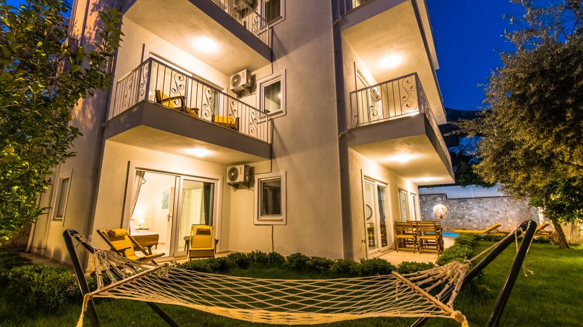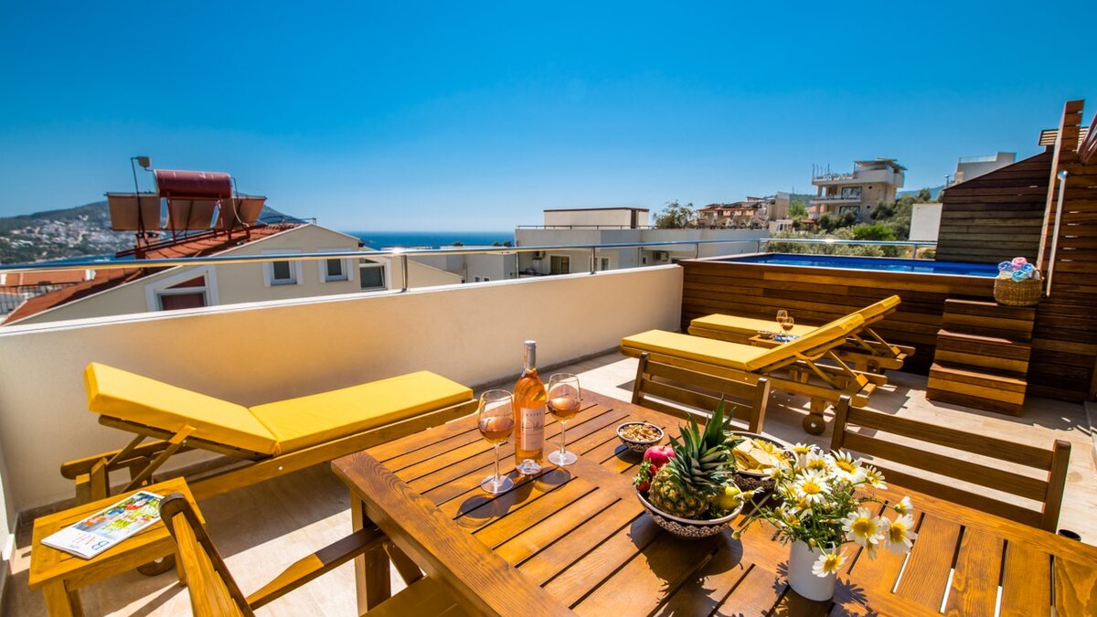 Villa Merkez ist eine Kombination aus drei Apartments in Kalkan, die zu einem kombiniert werden, um den Gästen einen erholsamen Aufenthalt mit sieben Schlafzimmern, einem Tauchbecken und einer Dachterrasse zu bieten.