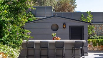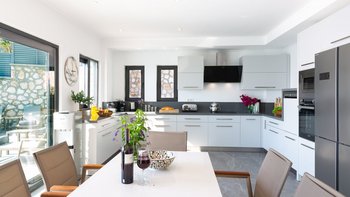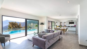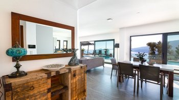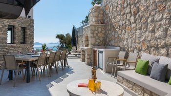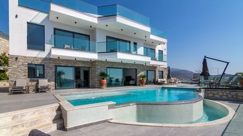 Eine moderne und geräumige Villa in Hanglage mit einem Infinity-Pool, einem Essbereich im Freien und einem atemberaubenden Blick über die Bucht von Kalamar.