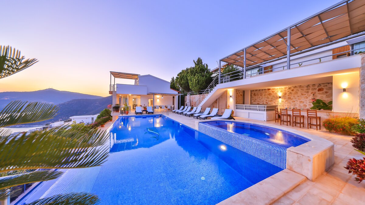 Die Außenbereiche sind wirklich fesselnd. Der Infinity-Pool mit Wasserfall-Funktion bildet einen atemberaubenden Blickpunkt, umgeben von bequemen Sonnenliegen. Ein separates Kinderbecken sorgt dafür, dass die jüngeren Gäste am Spaß teilnehmen können. Der Außenbar und der Sitzbereich sind perfekt, um am Abend einen Drink zu genießen, während Sie den Sonnenuntergang beobachten, und auch im Freien können Sie speisen. Mit mehreren Terrassen zur Auswahl, darunter ein Whirlpool im Freien und ein traditioneller türkischer Köşk zum Faulenzen, gibt es keinen Mangel an Orten zum Entspannen. Und da die charmante Altstadt von Kalkan nur einen kurzen Spaziergang entfernt ist, haben Sie einfachen Zugang zu lokalen Geschäften und Restaurants, während Sie die Privatsphäre Ihrer eigenen Villa genießen.