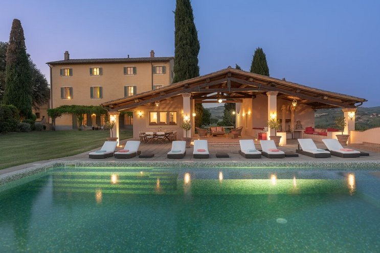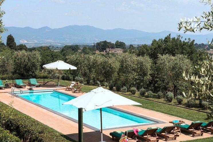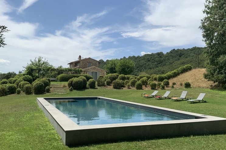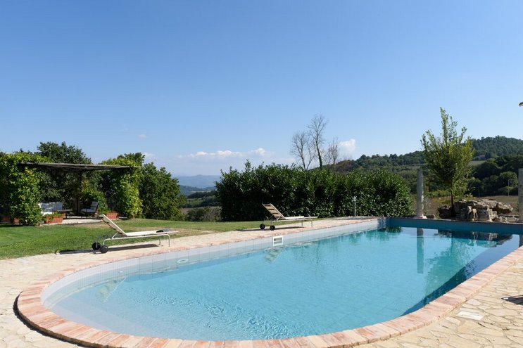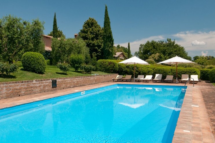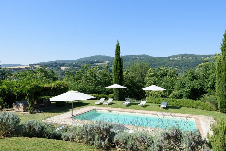 In einem weitläufigen Garten mit Rasen und Bäumen und mit Blick auf die Hirten vom außergewöhnlich großen Pool aus bietet diese Luxusvilla in Umbrien eine geräumige, moderne und sehr komfortable ländliche Idylle und profitiert auch von einem gemeinsamen Tennisplatz.