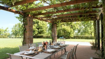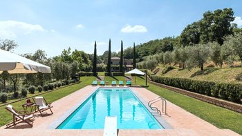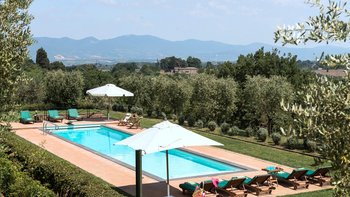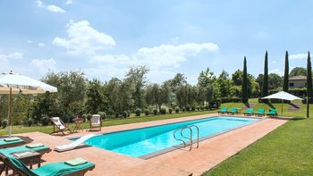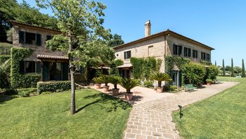 In einem weitläufigen Garten mit Rasen und Bäumen und mit Blick auf die Hirten vom außergewöhnlich großen Pool aus bietet diese Luxusvilla in Umbrien eine geräumige, moderne und sehr komfortable ländliche Idylle und profitiert auch von einem gemeinsamen Tennisplatz.