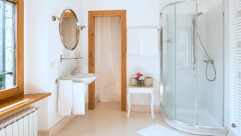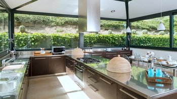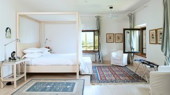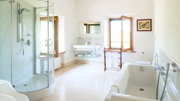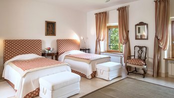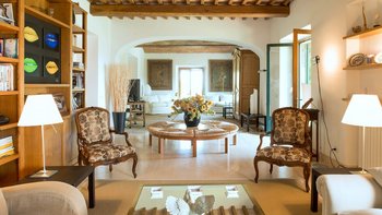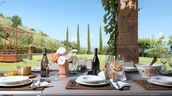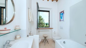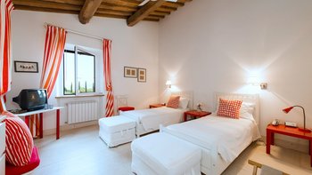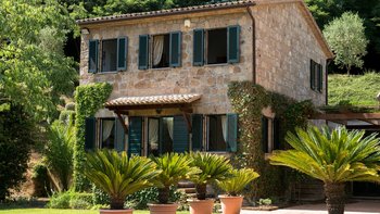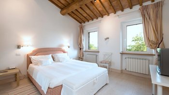 Auf einem sanft abfallenden Hügel gelegen, besteht diese feine Familienvilla aus einem imposanten Haus und einem angrenzenden Nebengebäude, beide mit ihren Steinmauern und Fensterläden, die typisch umbrisch-ländlich aussehen. Denen sehr eleganten Inneneinrichtungen sind also eine Überraschung. Dessen herrlich geräumige Wohnzimmer, das klassische Eleganz mit modernem Stil verbindet, verfügt über helle Holzböden, große weiße Sofas und erdfarbene Stoffe unter seinen Dachsparre- und Ziegelgewölbedecken. Deren klimatisierte Küche/Esszimmer, komplett aus gebürstetem Stahl und Glas, ist ein spektakuläres Beispiel für italienisches Design, das durch den (im Voraus buchbaren) Kochservice noch angenehmer wird. Die individuell gestalteten und mit exzellentem Bad ausgestatteten Zimmer sind ideal für zwei Familien eingerichtet, zwei davon befinden sich im Haupthaus und drei im Nebenhaus. Draußen bietet sich eine mit Wein beschattete Terrasse mit Blick auf die Gärten und ein 18 Meter langer Pool mit Strömungsströmungen, der in ebene Rasenflächen versenkt ist. Und etwa zehn Minuten zu Fuß entfernt befindet sich ein Tennisplatz mit Flutlicht, der von den Gästen von Le Crete und der Schwestervilla La Casetta geteilt wird. Dessen Villa ist nur eine kurze Fahrt von Orvieto und 2 km von den Geschäften in Porano entfernt.
