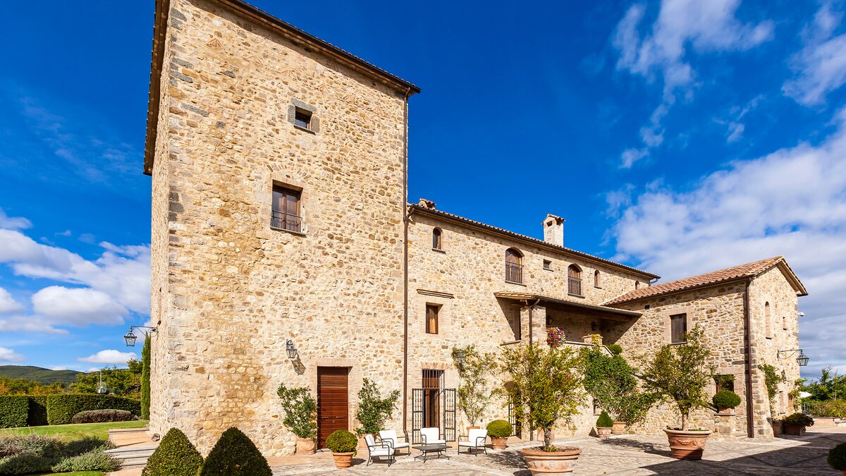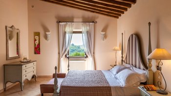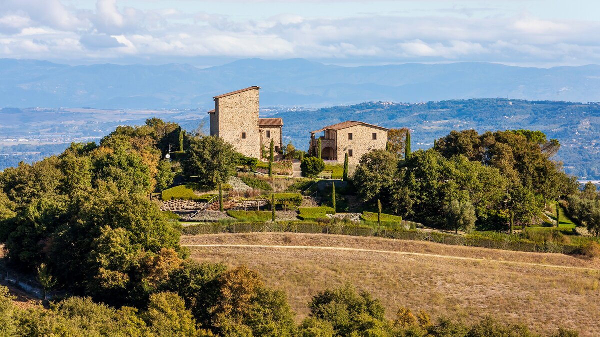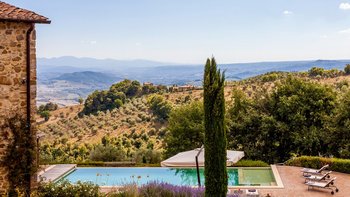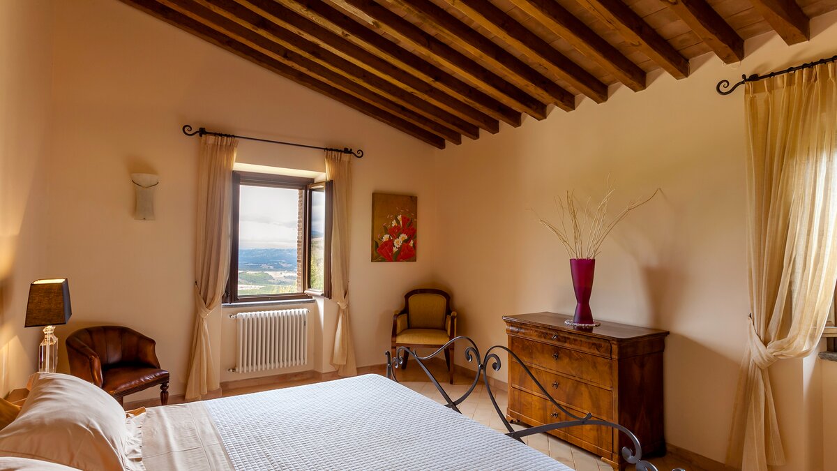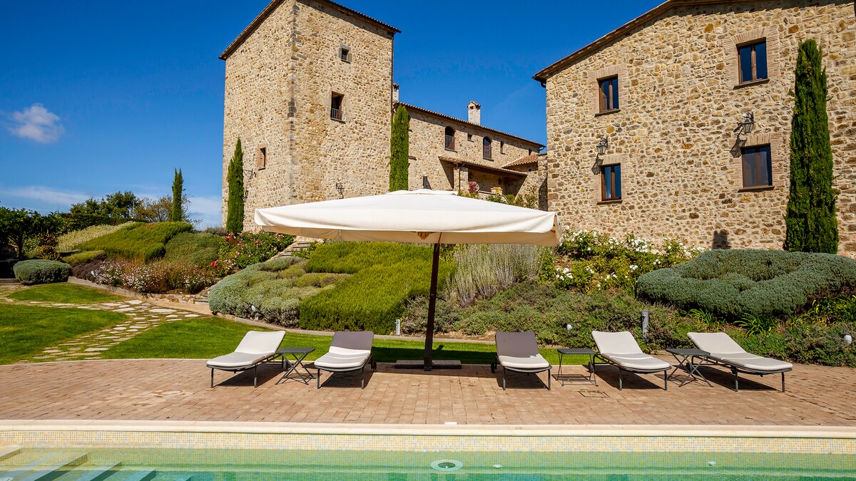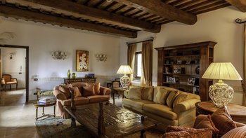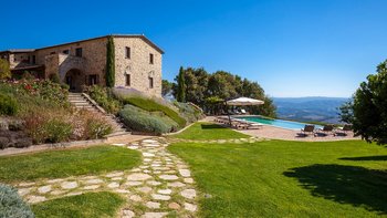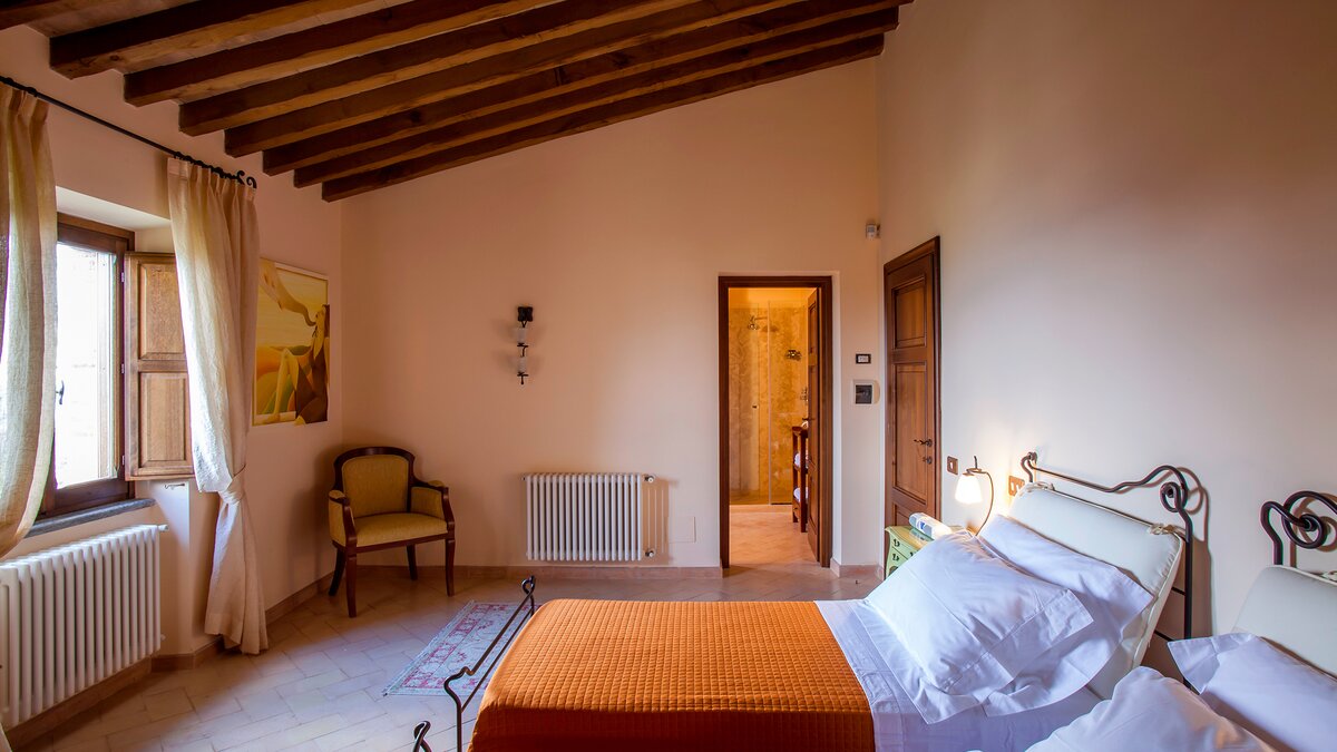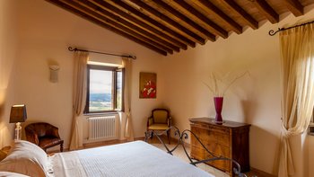 Die Villa Chianina befindet sich in Hanglage inmitten von Olivenbäumen und bietet einen unendlichen Blick auf die umbrische Landschaft und ist das ideale Urlaubsziel für große Familien oder Gruppen von Freunden, die einen erholsamen Rückzugsort in privater Umgebung suchen. Ein Innenhof, der die Hauptvilla und das Gästehaus verbindet, bietet einen Blick auf den privaten Infinity-Pool, mit vielen Liegestühlen zum Entspannen und dem Blick auf die Landschaft, die sich darunter erstreckt. Dessen Villa Chianina ist im typisch italienischen Stil eingerichtet und verfügt über moderne Einrichtungen für zusätzlichen Komfort. Mit Holzbalkendecken, Pastelltönen und modernen Möbeln ist die Villa Chianina eine elegante Mischung aus traditionellem und modernem Luxus. Die Hauptvilla verfügt über eine luxuriöse Eingangshalle, eine gut ausgestattete Küche, einen Frühstücksraum und ein Esszimmer im Erdgeschoss. Deren obere Ebene umfasst einen TV-Raum, eine exklusive Bar, einen Snooker-Raum und eine Lounge mit Zugang zum Balkon. Deren zweite Etage besteht aus einem Hauptschlafzimmer mit eigenem Bad und einem Doppelschlafzimmer mit Dusche en suite; das verbleibende Doppelschlafzimmer mit Dusche en suite befindet sich im dritten Stock.