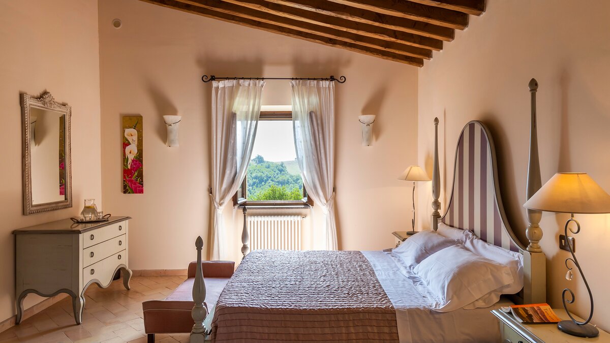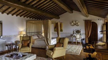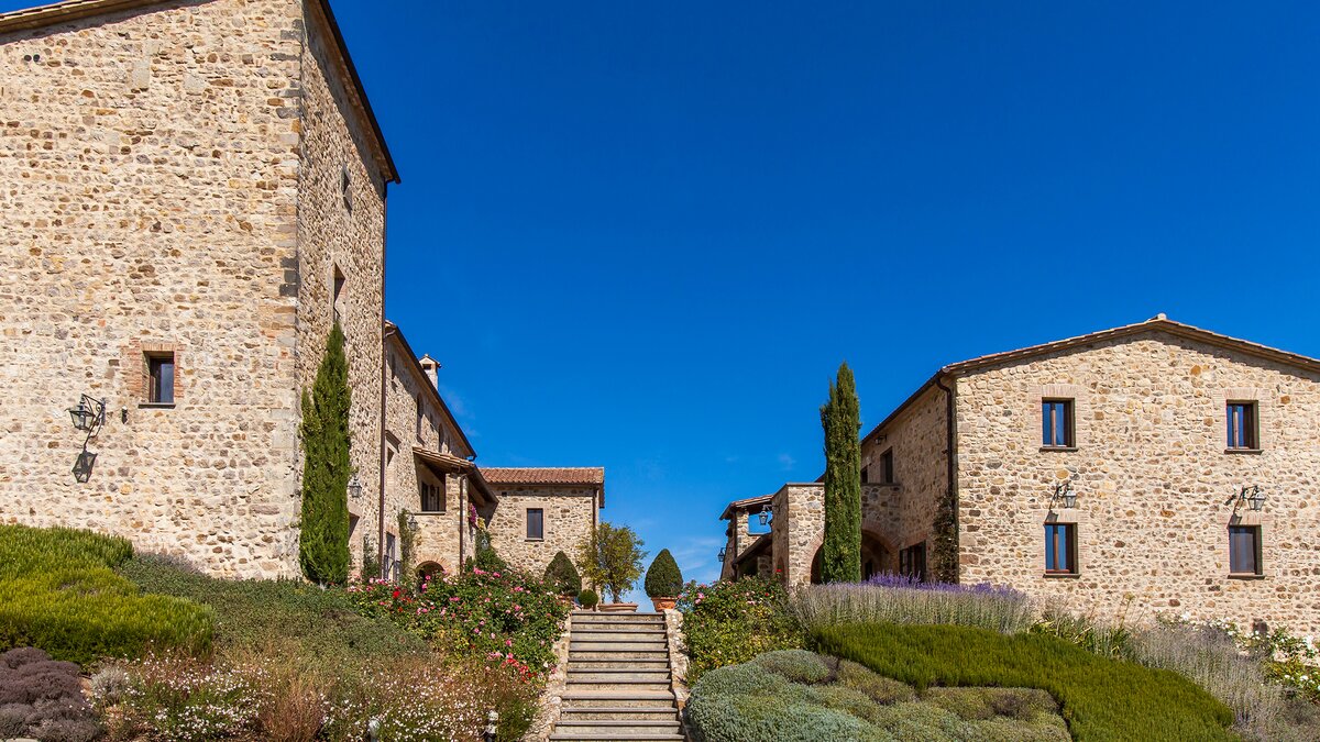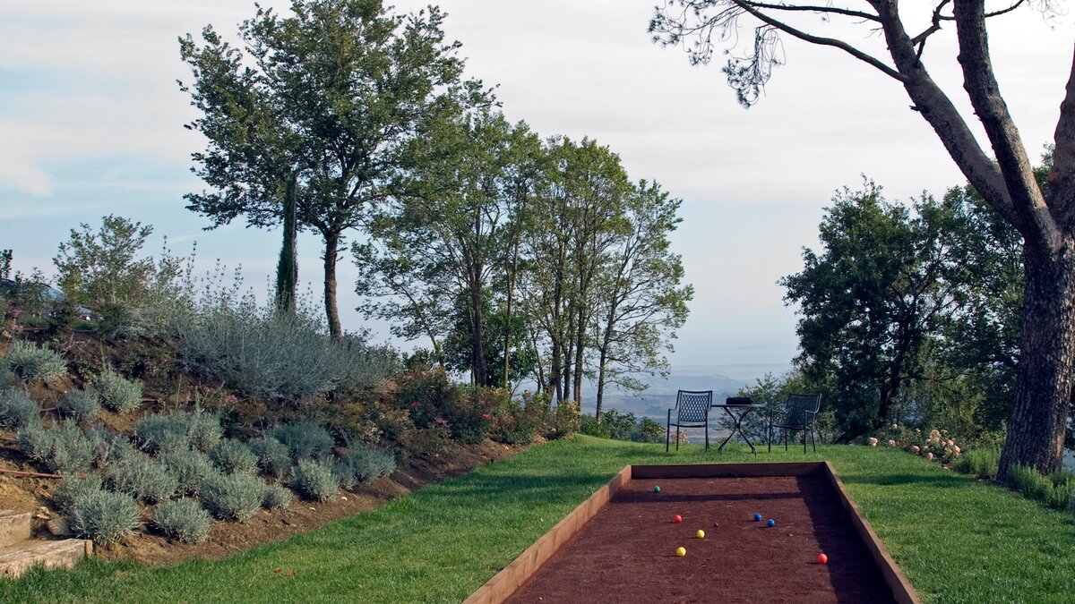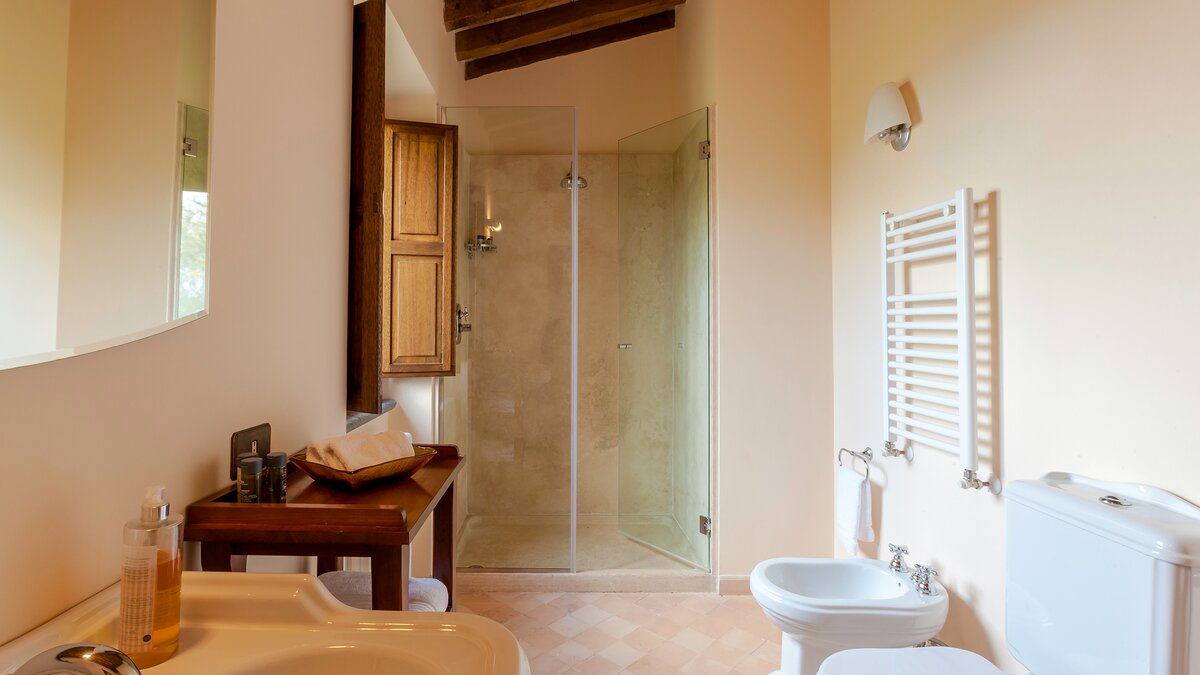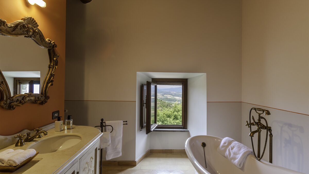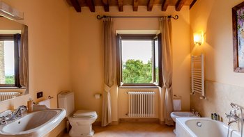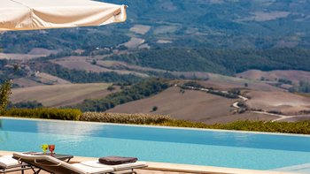 Die Villa Chianina befindet sich in Hanglage inmitten von Olivenbäumen und bietet einen unendlichen Blick auf die umbrische Landschaft und ist das ideale Urlaubsziel für große Familien oder Gruppen von Freunden, die einen erholsamen Rückzugsort in privater Umgebung suchen. Ein Innenhof, der die Hauptvilla und das Gästehaus verbindet, bietet einen Blick auf den privaten Infinity-Pool, mit vielen Liegestühlen zum Entspannen und dem Blick auf die Landschaft, die sich darunter erstreckt. Dessen Villa Chianina ist im typisch italienischen Stil eingerichtet und verfügt über moderne Einrichtungen für zusätzlichen Komfort. Mit Holzbalkendecken, Pastelltönen und modernen Möbeln ist die Villa Chianina eine elegante Mischung aus traditionellem und modernem Luxus. Die Hauptvilla verfügt über eine luxuriöse Eingangshalle, eine gut ausgestattete Küche, einen Frühstücksraum und ein Esszimmer im Erdgeschoss. Deren obere Ebene umfasst einen TV-Raum, eine exklusive Bar, einen Snooker-Raum und eine Lounge mit Zugang zum Balkon. Deren zweite Etage besteht aus einem Hauptschlafzimmer mit eigenem Bad und einem Doppelschlafzimmer mit Dusche en suite; das verbleibende Doppelschlafzimmer mit Dusche en suite befindet sich im dritten Stock.