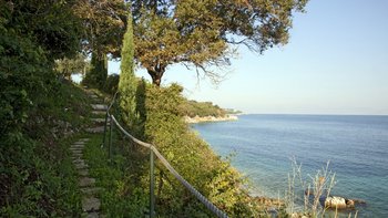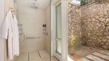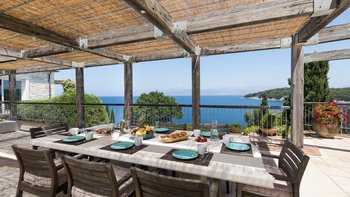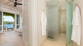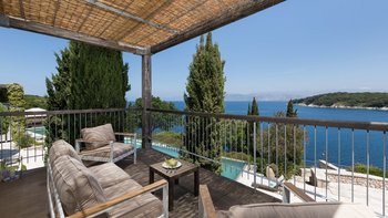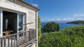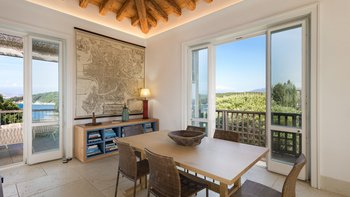 Dies ist eine wirklich bemerkenswerte Villa in jeder Hinsicht. Am offensichtlichsten ist der 40-Meter-Infinity-Pool mit seinem wunderschönen Pavillon an einem Ende und herrlichem Blick auf die Bucht darunter. Dessen Steinvilla ist hervorragend für Freizeit und Luxus konzipiert und besteht aus drei Gebäuden im Pavillon-Stil, von denen jedes seinen eigenen Blick auf das Meer und das Festland dahinter hat. Allen sind von duftenden Kräutergärten und weitläufigen Terrassen umgeben, die stilvoll eingerichtet sind, um im Freien zu speisen und zu entspannen, und Wege führen hinunter zu zwei Kiesstränden und einer Yoga-Plattform über dem Wasser.