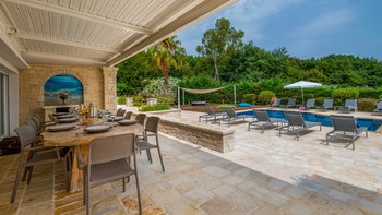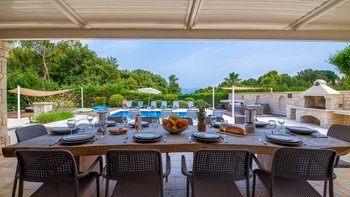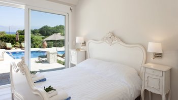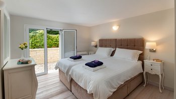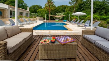 Innen und außen stilvoll gestaltet, gibt es schöne und komfortable Wohnräume für einen nahtlosen Innen- und Außenlebensstil. Im Erdgeschoss gibt es ein offenes Grundriss Wohnzimmer und eine Küche mit Frühstückstheke, mit Glasschiebetüren, die zu einer Essveranda für Mahlzeiten im Freien führen. Stufen führen hinunter zu einer sonnigen Terrasse mit Liegestühlen, in die der Privater Pool versenkt wird, während der Terrassenbereich mit einer komfortablen Außenlounge und einem Jacuzzi ausgestattet ist. Drei der Schlafzimmer befinden sich im Erdgeschoss und öffnen sich zu einer Terrasse, dem Hauptschlafzimmer mit Doppelbett und eigenem Bad und einem Zweibett- und einem Doppelschlafzimmer mit eigenem Duschbad. Eine Treppe führt hinunter zu einem Fernsehraum im unteren Erdgeschoss, wo sich auch ein Schlafzimmer mit zwei Einzelbetten und ein Schlafzimmer mit drei Einzelbetten befinden, beide mit Duschbad en suite. Kinder sind hier gut versorgt, mit einem Baumhaus, einem Spielhaus mit Sandkasten und einer Tischtennisplatte. Indiana liegt nur einen kurzen Spaziergang von den hübschen weißen Kieselsteinen und dem türkisfarbenen Wasser des Coyevinas Strandes entfernt. Dessen hübsche Dorf Kassiopi und das charmante St. Stephano sind nur eine kurze Autofahrt entfernt. Dies ist eine ausgezeichnete Wahl für eine große Familie oder eine Gruppe von Freunden.