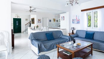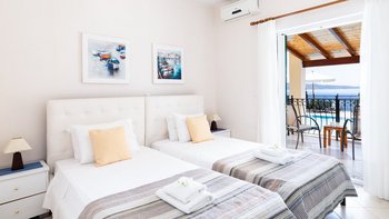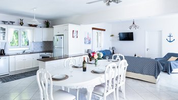 Diese einladende Villa ist über einen Stufenweg zu erreichen, zwei Minuten zu Fuß vom Parkplatz entfernt und bietet einen herrlichen Blick auf das Meer, direkt über einem hübschen kleinen Strand, wo glatte Felsen ein Geschenk der Natur zum Sonnenbaden sind und Boote am Ende eines Segeltages festgemacht werden können. Thalassa ist eine ausgezeichnete Wahl für zwei Familien oder eine Gruppe von Freunden und verfügt über ein Haupt-Doppelzimmer und ein Zweibettschlafzimmer in jedem der linken und rechten Flügel, alle mit Zugang zu einem Balkon, und ein Studio für zwei Personen auf der unteren Ebene (Poolseite) mit eigener Küchenzeile. Dazwischen befindet sich im Erdgeschoss ein helles und geräumiges, offen geschnittenes Wohnzimmer, das Küche, Ess- und Sitzbereiche kombiniert, mit Fenstertüren auf die möblierte Terrasse für einen herrlichen Blick auf die Küste. Mit Satellitenfernsehenund WLAN und Klimaanlage in allen Schlafzimmern lädt diese sehr komfortable Villa auch im Freien ein, wo es am Pool genügend Liegestühle gibt und ein schattiger Essbereich am Pool mit Pergola und eingebautem Grill. Der Strand von St. Stephano ist nur fünf Minuten zu Fuß von der Villa entfernt, und Kassiopis Nachtleben und Avlaki sind beide nur eine kurze Autofahrt entfernt.