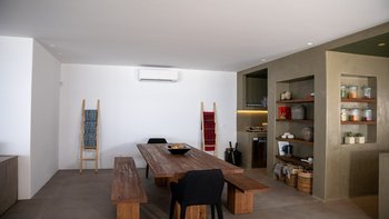 Das Herz des Beach House Amira ist das geräumige Wohnzimmer mit raumhohen Fenstern, die den Blick auf das Meer und die Berge rahmen. Dieser zentrale Raum geht nahtlos in den Essbereich über und schafft einen offenen Grundriss, der ideal für Geselligkeit und Entspannung ist. Dessen an diese Bereiche angrenzende voll ausgestattete Küche ist der Traum eines kulinarischen Enthusiasten und in der Lage, große Gruppen oder Zusammenkünfte im kleinen Kreis zu bewirten.