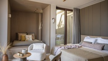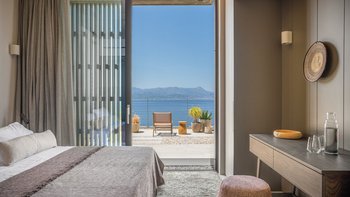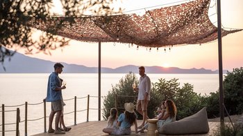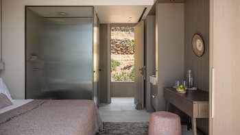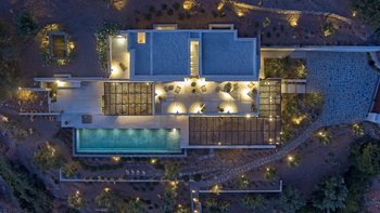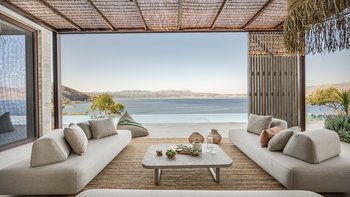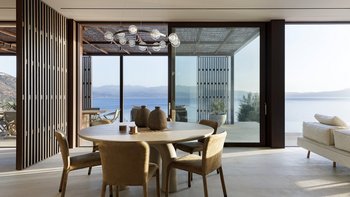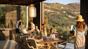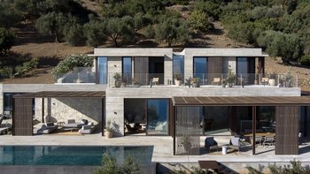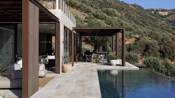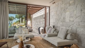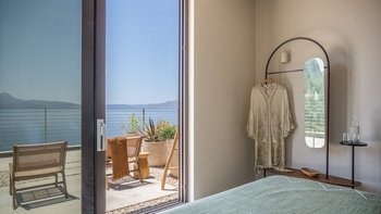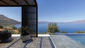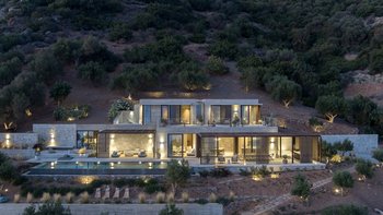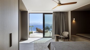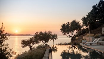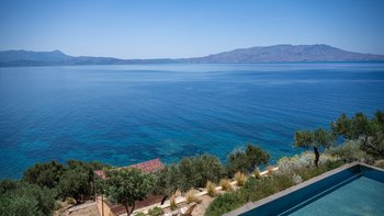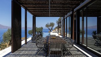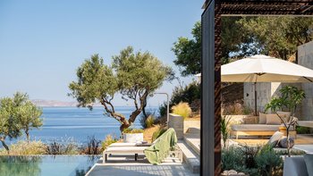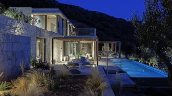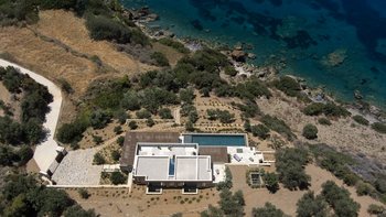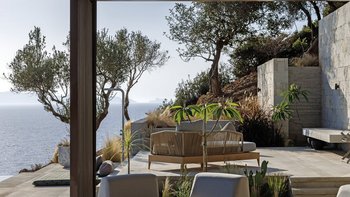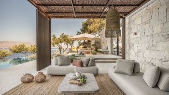 Draußen erwartet Sie eine Oase der Ruhe. Der Infinity-Pool verschmilzt nahtlos mit dem Horizont und erzeugt einen faszinierenden visuellen Effekt, während ein üppiger Garten mit Olivenbäumen, duftenden Kräutern und einheimischen Pflanzen einen ruhigen Rückzugsort bietet, der die Gäste mit der Schönheit der Natur verbindet. Deren offene Küche und die Bar bieten den perfekten Rahmen für ein Abendessen im Freien, wo Sie Ihre Mahlzeiten in der Sonne teilen können. Im Herzen des Außenbereichs befindet sich eine Yoga-Terrasse, auf der die Gäste den Morgen mit sanfter Bewegung beginnen können, die frische Meeresluft einatmen und den endlosen Panoramablick genießen können.