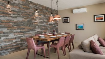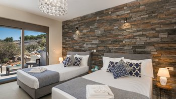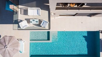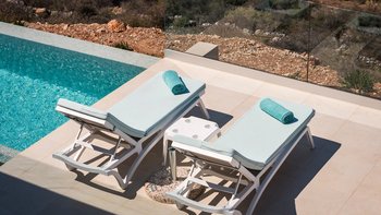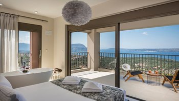 Der offene Wohnbereich schließt nahtlos an die Außenterrassen an, wo Sie einen privaten Infinity-Pool, Liegestühle und schattige Ess- und Sitzbereiche finden, die zum Entspannen einladen und die atemberaubende Umgebung genießen. Jedes Zimmer ist hell und elegant eingerichtet, alle mit eigenem Bad und Zugang zu einer Terrasse oder einem Balkon.