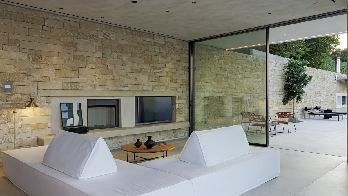 Im Inneren befindet sich das Hauptgeschoss der Villa in einem lichtdurchfluteten Raum mit einem offenen Wohn- und Essbereich, der von raumhohen Fenstern eingerahmt wird, die direkt auf die Terrasse und den Infinity-Pool führen. Eine voll ausgestattete Küche mit zwei Öfen, zwei Kühlschränken und einer Kaffeemaschine macht die Selbstverpflegung mühelos, während eine Garderobe den Gästen zusätzlichen Komfort bietet.