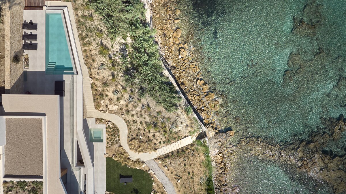 Im Freien steht der Infinity-Pool im Mittelpunkt, flankiert von Liegen und Sonnenschirmen für entspannte Nachmittage. Ein schattiger Essbereich mit eingebautem Gasgrill lädt zu langen, gemütlichen Mahlzeiten mit Blick auf das Wasser ein. Von der Terrasse aus führt ein Weg direkt zum Meer, wo Sie morgens ein erfrischendes Bad nehmen oder nachmittags in der Sonne verbringen können.
