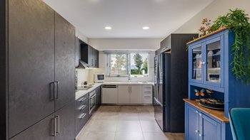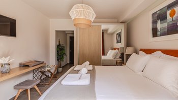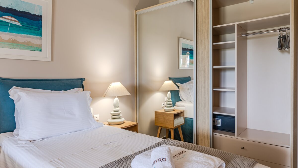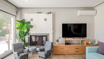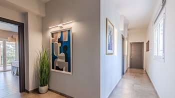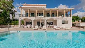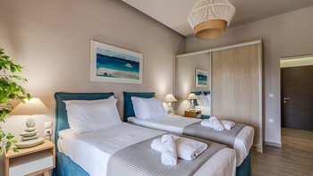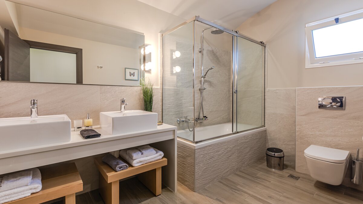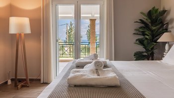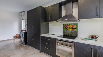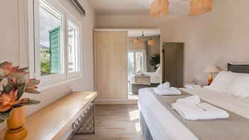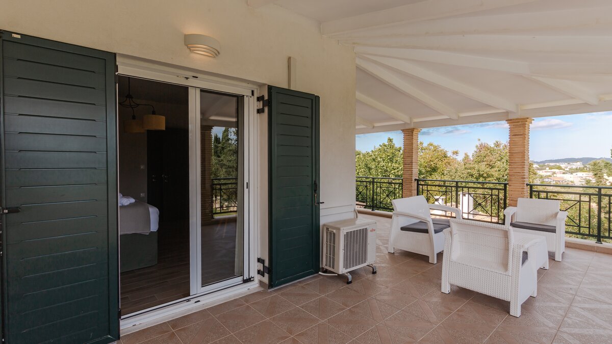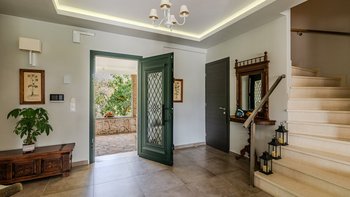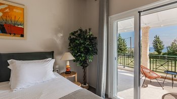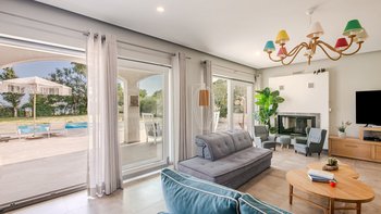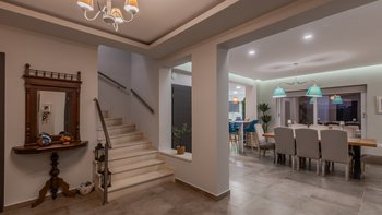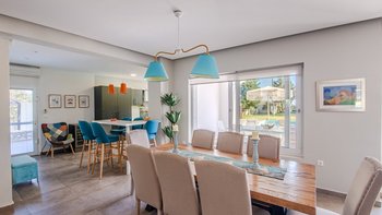Die gewölbte überdachte Terrasse führt zum geräumigen Wohnbereich der Villa, der den größten Teil des Erdgeschosses einnimmt. Es gibt einen modernen, wenn auch skurrilen Stil – schöne Farbelemente erwecken den Wohnbereich zum Leben, und es gibt viele bequeme Sitzgelegenheiten für gemütliche Nächte in der Villa. Der Sitzbereich führt zum Esstisch im Innenbereich, sodass Sie wählen können, ob Sie drinnen essen oder auf den angrenzenden Terrassentisch gehen möchten. Direkt am Ende der Etage befindet sich die moderne Küche. Es gibt eine Frühstücksbar und alle modernen Kücheneinrichtungen, die diesen Aufenthalt zu einem sehr komfortablen Aufenthalt machen. Im zweistöckigen Design der Villa befinden sich vier geräumige Schlafzimmer – eines mit Doppelbett im Erdgeschoss und weitere drei im ersten Stock. Während alle Zimmer einen anderen Stil haben, verfügt jedes über ein großzügiges, modernes Bad und ein unglaublich bequemes Doppelbett. Denen Zimmer im ersten Stock haben auch den Luxus, auf eine große private Terrasse mit fantastischem Blick auf die Bucht zu führen.