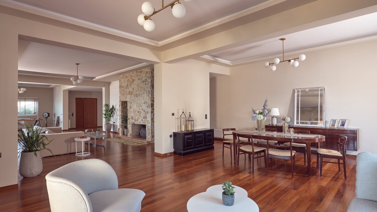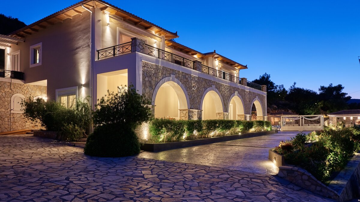 Durch die großen Steinbögen verfügt das offene Erdgeschoss über einen Essbereich, Büroräume und eine große Industrieküche. Der Sitzbereich ist gut positioniert vor einem großen Kamin, der nicht umhin kann, ins Auge zu fallen. Im Obergeschoss befinden sich sechs geräumige Schlafzimmer – eines mit Kingsize-Bett, vier mit Doppelbetten und eines mit zwei Einzelbetten. Denen Zimmer sind wunderschön – harmonisch in neutralen Farbtönen eingerichtet, um die ruhige Aussicht von außen zu reflektieren – und alle mit Ausnahme eines öffnen sich auf einen umliegenden Balkon mit Blick auf die Laganas Bucht. Geschäfte und Restaurants in der Nähe finden Sie in Limni Kerri (nur 1,5 km von der Villa entfernt), während die Hauptstadt der Insel, Zakynthos, nur 18 km entfernt ist.