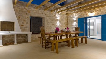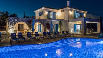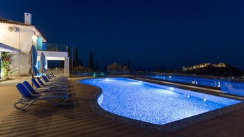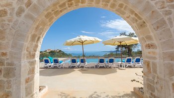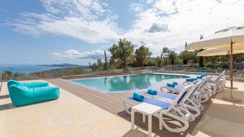 Der Außenbereich dieser Villa ist der Ort, an dem sie wirklich zum Leben erweckt wird, wo ein 13 m großer Pool ideal für große Gruppen ist oder Kindern das Schwimmen beibringt, mit herrlichem Blick auf Kefalonia und den Peloponnes. Dessen Terrasse ist der perfekte Ort, um vor dem Abendessen einen Cocktail zu genießen, während der Esstisch im Freien ist, wo die Gäste lange, faule Mittagessen und laue Abende unter dem Sternenhimmel genießen können. Agios Nikolaus ist nur eine kurze Autofahrt entfernt, wo ein kleiner, aber schöner Hafen eine Auswahl an Tavernen am Wasser beherbergt. Außerdem können Sie von hier aus Bootsausflüge zu den berühmten blauen Höhlen und dem Strand von Navagio unternehmen.