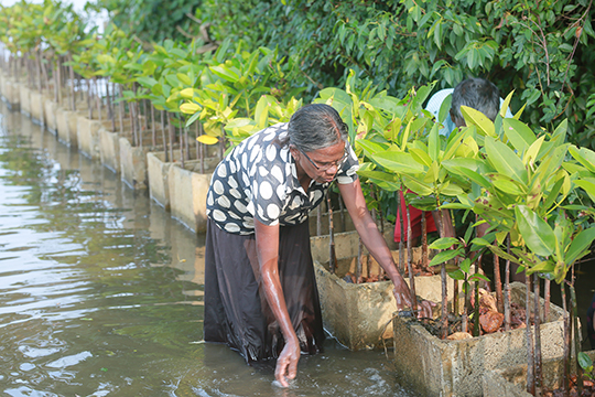 2017 begann man mit dem Pflanzen von Mangrovenbäumen, und zwar in schlammgefüllten bodenlosen Fässern entlang des Ufers. Etwa drei Jahre nach Anpflanzung entwickeln sich spezielle Wurzeln und bilden eine natürliche Uferbarriere vor der Lagune. Das Wurzelsystem einer Mangrovenpflanze muss mindestens sieben Jahre lang geschützt werden, damit es auch bei starker Erosion überleben kann. Nach acht Jahren wird das Fass entfernt und zersetzt sich natürlich – die Bäume wachsen nun frei. Ein toller Nebeneffekt: Die Schlammschicht in und um die Fässer begünstigt auch das Wachstum der umstehenden Mangroven. Durch das Pflanzen von Mangroven leistet das Projekt nicht nur einen Beitrag zum Naturschutz, sondern auch zur Reduzierung von CO₂-Emissionen.
