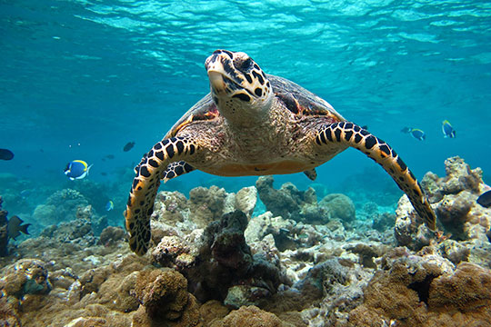 Sie sind an den Riffen der Malediven zuhause und gehören zu den Lieblingen aller, die der Unterwasserwelt schnorchelnd oder tauchend einen Besuch abstatten: Meeresschildkröten. Die anmutigen Geschöpfe entzücken unter Wasser bei der Futtersuche ebenso wie an der Oberfläche beim Luftholen – ein Schauspiel, an dem man sich kaum sattsehen kann. Man darf sich den Schildkröten dabei sogar vorsichtig und in einer gesunden Distanz nähern, sie lassen sich nicht stören. Wieso auch, denn Menschen sind für die Tiere meist ungefährlich.