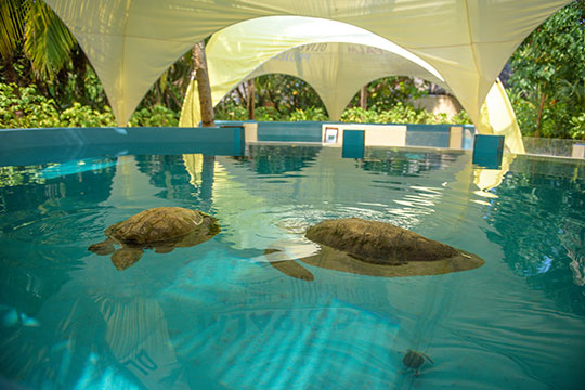 Das in England gegründete Olive Ridley Project setzt sich für den Schutz der Meeresschildkröten im Indischen Ozean ein. Seit ein paar Jahren betreibt die Organisation ein Pflegezentrum für verletzte Meeresschildkröten auf der Insel Coco Palm Dhuni Kolhu. Mittlerweile werden Tiere aus den ganzen Malediven ins Resort im Baa-Atoll gebracht. In der Auffangstation kümmert sich eine Veterinärin zusammen mit einem Team von Freiwilligen um die Patienten, bis hin zur Operation. Feriengäste der Insel sind eingeladen, die Station zu besichtigen und bei einer Fütterung der Schildkröten dabei zu sein. Mit etwas Glück können sie sogar miterleben, wie eine genesene Schildkröte zurück ins Meer entlassen wird.