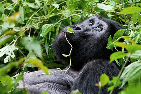 Ein leises Rascheln, gefolgt von tiefem Grunzen, dann öffnet sich das Immergrün des Dschungels und plötzlich sind sie da: Ein mächtiger Silberrücken und eine Gruppe Berggorillas, die sich ungestört beobachten lassen.