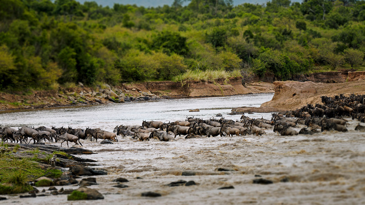 Die Strasse vom Ololo Gate gleicht einem halb ausgetrockneten Flussbett..Wir können oft nur Schritttempo fahren und müssen immer wieder riesige Wasserflächen durchqueren. Am späten Nachmittag erreichen wir unser Camp, das wunderschön auf einer Hügelkette mit traumhafter Sicht auf die Masai Mara gelegen ist. Zebras, Giraffen, Büffel, Elefanten, Antilopen, Tausende von Gnus, Zebras, Warzenschweine und ein Löwenmännchen in der Sonne sowie ein Rudel Löwenjungen und deren Mutter geben tolle Fotosujets. Mittagessen gibt es direkt am Mara Fluss, während wir eine Herde Gnus beobachten, die den Fluss überqueren will. Die vielen Geier, die Krokodile und die toten Gnus im Fluss, welche frühere Querungen nicht geschafft haben, sprechen eine deutliche Sprache. Nach gut zwei Stunden traut sich das erste Gnu dann endlich ins Wasser – es folgen Hunderte. Ein einmaliges Spektakel. Wir halten die Luft an, aber es schaffen es alle Tiere wohlbehalten über den Fluss.