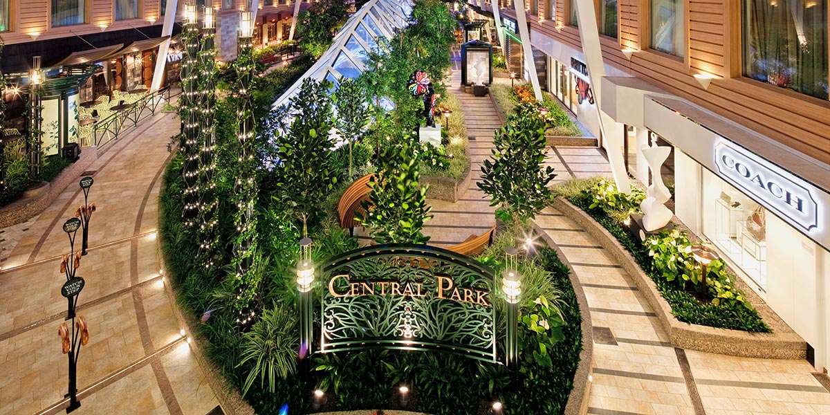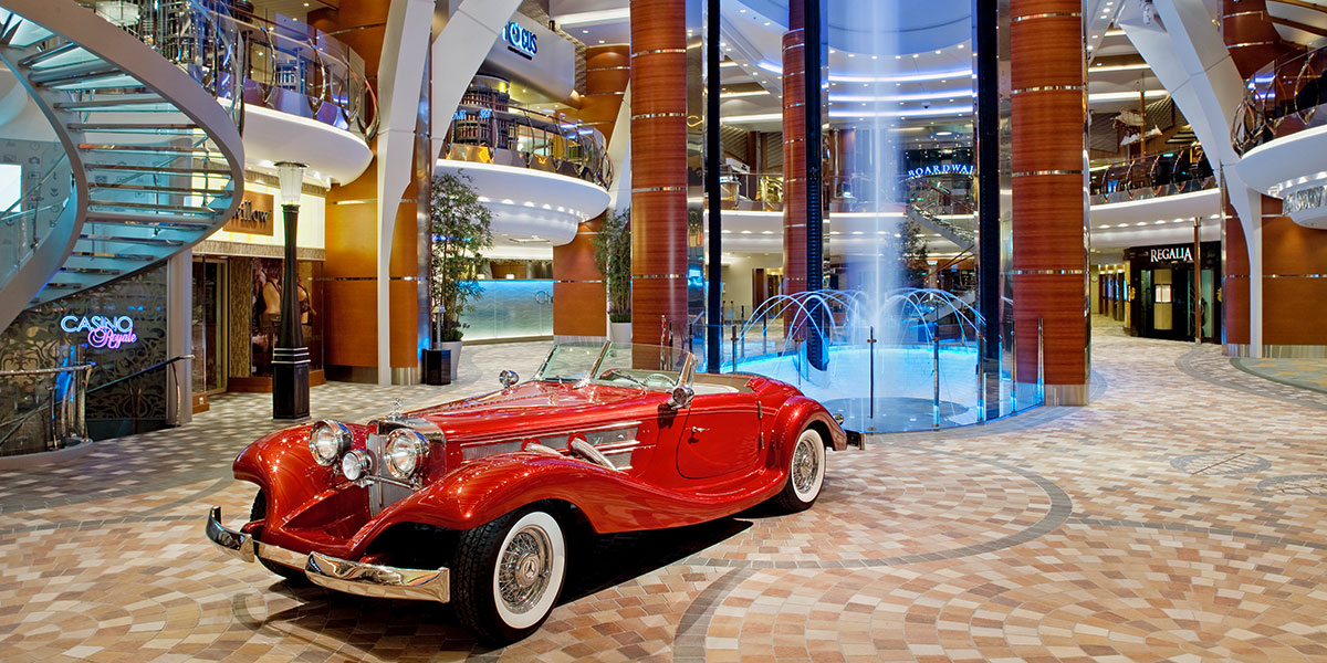 Wer erwartet auf einem Kreuzfahrtschiff schliesslich eine blühende Parkanlage mit Tausenden echter Pflanzen und Bäume? Eine Bar, die auf einem Wasserstrahl von einem Deck zum nächsten zu schweben scheint? Ein Jahrmarkt-Karussell mit nostalgischer Drehorgel-Musik? Eine Wasserfontänen Show? Und hoch über den Köpfen der Passagiere verläuft über dem Boardwalk am Heck des Schiffs eine «Zipline» – ein Stahlseil, an dem sich mutige Gäste seilbahnartig von einer Seite zur anderen schwingen.