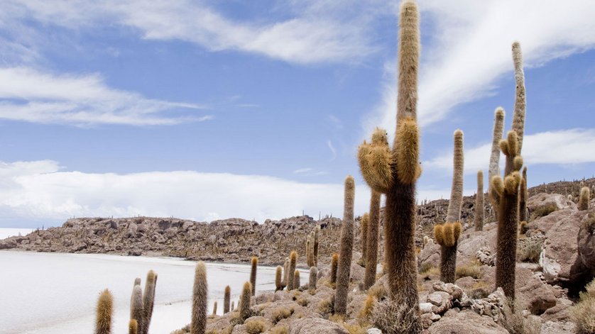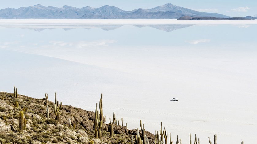 Ich stehe vor der grössten Salzwüste der Erde und habe plötzlich wahnsinnigen Durst. Als müsste ich kompensieren, was seit 40 000 Jahren nicht mehr da ist. Der riesige Minchin-See. Es ist so hell. Ohne Sonnenbrille erblindet man hier schnell. «Kennt ihr Salvador Dalis Bild mit den Elefanten?» fragt uns der Tourguide Roberto. «Er ist einer der wenigen, der die Landschaft realistisch dargestellt hat», scherzt er. Dalì war nie in der Salar de Uyuni. Die gigantischen Monsterkakteen auf einer Insel inmitten dieser riesigen Fläche, die sogar vom Mond aus zu sehen ist, wirken wie aus dem All gefallen. Die rosa Flamingos, die sich vor dem von Mineralien gefärbten Lago Colorado tummeln, könnten mit ihren langen dünnen Beinen wirklich aus Dalìs Pinsel stammen.