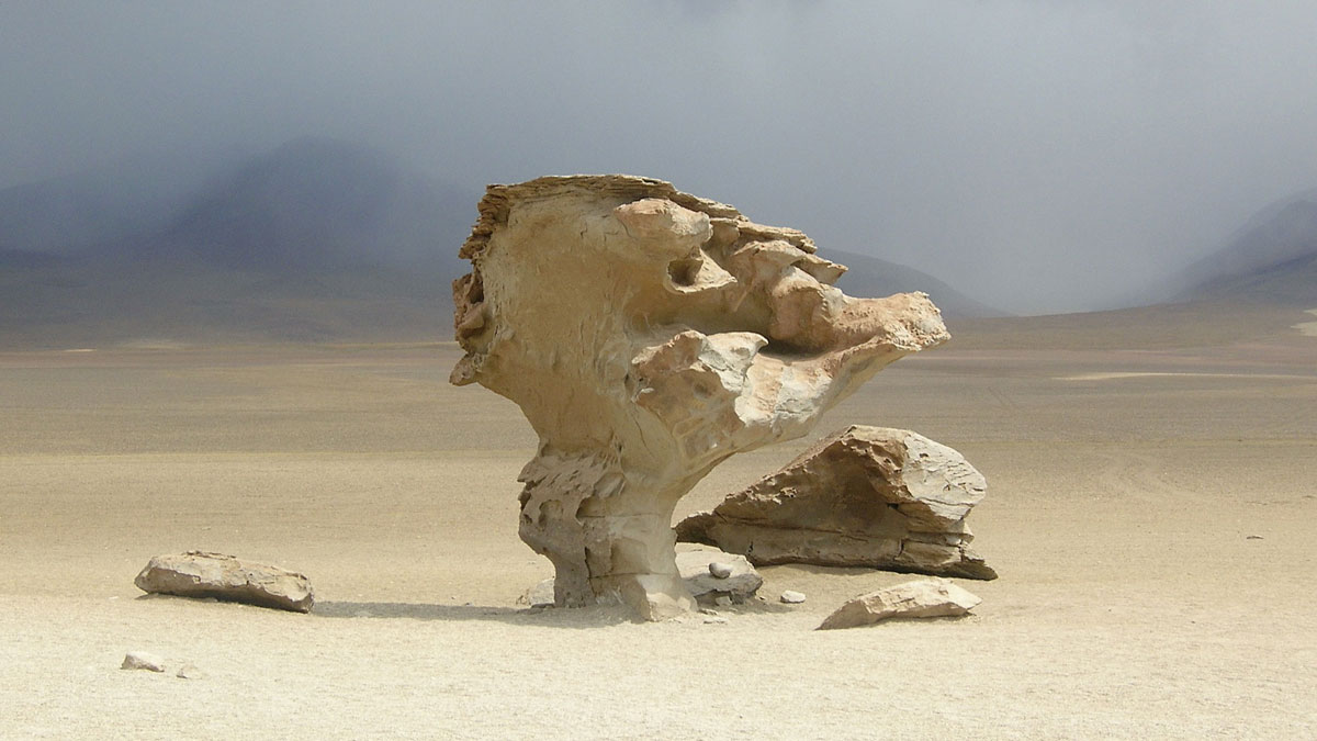 Der Gegend haftet etwas Surreales an und beim Anblick läuft mir seltsamerweise das Wasser im Mund zusammen. Als wir dann noch ein ganzes Hotel aus Salz betreten, muss ich etwas essen. Die eiweissreichen Samen, die bis auf 4500 Meter Höhe anspruchslos gedeihen, essen die Bergvölker schon seit tausenden von Jahren. Quinoa — bei uns total hip, in Uyuni ein Getreide, das schon von den Inkas als heilig angesehen wurde. Unser letzter Stopp der dreitägigen Tour mit dem Jeep hätte Dalì sicherlich gefallen. Vor uns ein riesiger Stein, der durch Sandstürme und Regen eine Baumform angenommen hat. Mir wird schwindlig. Wenn dieser Gigant doch nur ein echter Baum wäre, denke ich. Dann hätte ich endlich genügend Sauerstoff.