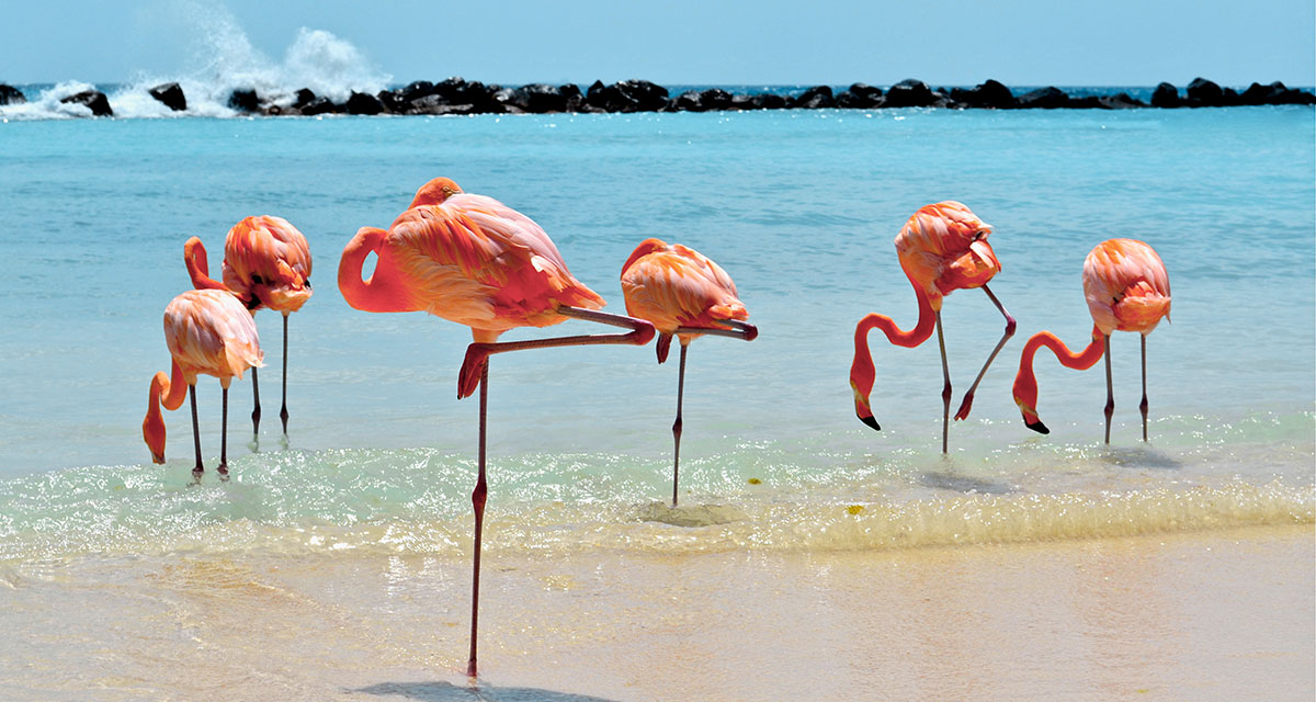 Auf meiner Jeeptour durch das Inselinnere begegnen mir meterhohe Kakteen und schier endlose Aloe Vera-Felder. Eine weitere Möglichkeit die Insel zu erkunden ist eine Fahrt mit dem «Kukoo Kunuku» – ein knallbunter Partybus, der alle Bewohner beim Vorbeifahren zum Tanzen und Singen animiert! Meine Tour endet am California Lighthouse, einem wunderschön restaurierten Leuchtturm am zerklüfteten Nordende der Insel. Wohlwissend, dass hier einige Touristen einen Stop einlegen, bietet ein Insulaner hier aus seinem Truck heraus frische, gekühlte Kokosnüsse an – herrlich erfrischend! Am nächsten Morgen geht es zum berühmten Flamingo Beach der Renaissance Private Island mit neugierigen Flamingos. Ein einmaliges Erlebnis!