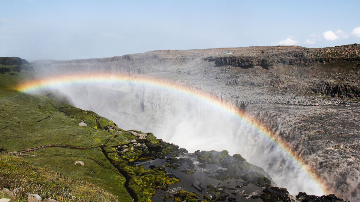 Meinen schönsten Moment erlebte ich am Norden gelegenen Dettifoss – mein Lieblings-Wasserfall Islands! Wir starteten bei leichtem Nieselregen beim Parkplatz, den wir von Myvatn innerhalb einer knappen Stunde Anreise erreichten. Wie in einer Mondlandschaft sah es aus, von Wasserfall keine Spur. Es sollen nur 1,5 km sein, der Schotterweg ist recht gut, und so entschliessen wir uns, doch weiterzugehen. Der Dettifoss ist das Endstück des Asbyrgi-Canyons, einer Felsschlucht, die sich über mehrere Kilometer fast bis zur Küste zieht. Zuerst hören wir den Dettifoss nur: Die Wassermengen, die hier täglich weit in die Schlucht stürzen, sind unglaublich. Als wir den Dettifoss dann in seiner ganzen Pracht sehen – mehrere Terrassen bieten verschiedene Ausblicke auf die Wassermassen –, kommt die Sonne, und damit zeigen sich ganze drei Regenbogen über dem Fluss. Ich will hier nie mehr weg! Die Natur ist unsagbar schön.