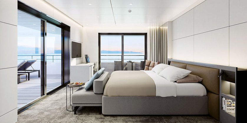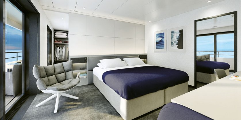 Die modernen 6 Aussenkabinen (17 m²) mit grossem Panoramafenster und 44 Suiten (26.5 m² bis 108 m²) mit Balkon oder Terrasse sind mit bestem Komfort ausgestattet. Die Betten, umhüllt mit feinster ägyptischer Leine, laden zu süssen Träumen ein. Auf dem privaten Balkon geniesst der Gast die Aussicht in gemütlichen Stühlen mit flauschigen Kissen. Die Terrassen der höheren Suiten Kategorien sind mit Liegestühlen und einer gemütlichen Lounge sowie Salontisch ausgestattet.