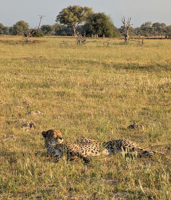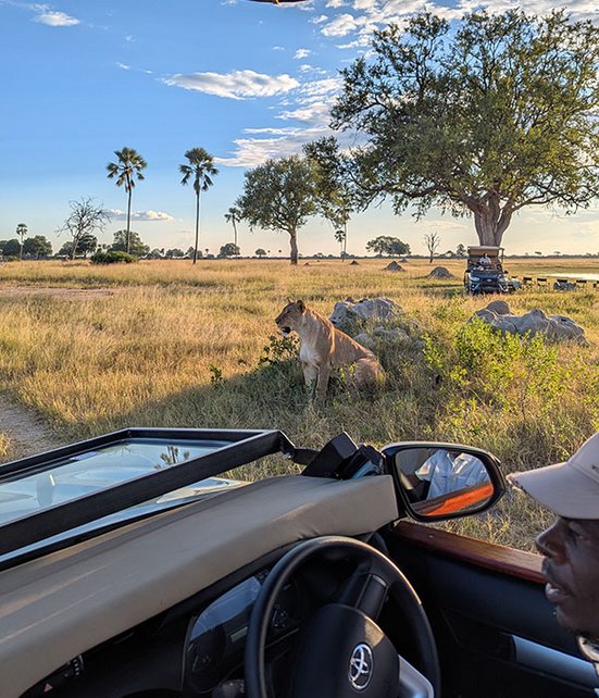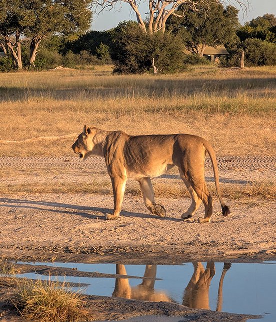 Am nächsten Morgen war die Vorfreude gross, denn laut unserem Ranger bestand die Gelegenheit, zum Sonnenaufgang Löwen oder Geparden zu sehen. So schnell war ich am Morgen wohl noch nie bereit. Der Guide fuhr mich in die Nähe einer grossen Ebene, und nun hiess es warten. Die Sonne kletterte langsam über den Horizont, doch noch war kein Löwe zu sehen. Weitere 15 Minuten vergingen, bis mein Guide Bewegung im Dickicht erspähte. Eine Löwin wollte die Wärme der ersten Sonnenstrahlen nutzen und legte sich nur 50 Meter von uns entfernt hin. Ein perfekter Start in den Tag! Kaum hatten wir uns von der Löwin verabschiedet, erblickten wir zwei Geparden, die eine Gnuherde jagten. Die Spannung stieg ins Unermessliche, doch schliesslich entschieden sich die beiden gegen einen Versuch, und wir kehrten ins Camp zurück. Ich freute mich auf ruhige Stunden im Camp. Zu diesem Zeitpunkt ahnte ich noch nicht, welches Spektakel mich am Nachmittag erwarten würde. Kurz vor 15 Uhr gerieten die Paviane rund ums Camp in helle Aufruhr. Solche Warnrufe bedeuten in der Regel, dass sich ein Raubtier in der Nähe befindet. Also schnappten wir uns schnell unser Equipment und stiegen ins Fahrzeug. Als wir einmal rund ums Camp fuhren, tauchten sie vor uns auf: Nicht ein, nicht zwei oder drei, sondern ganze zwölf Löwen – eine ganze Familie – waren auf Wanderschaft. Die Löwen schienen jedoch nicht in Jagdstimmung zu sein, der Alarm der Paviane war also unbegründet. Die entspannte Stimmung der Löwenfamilie bot uns einzigartige Anblicke: Die Kleinsten tollten herum, während die älteren Tiere genüsslich vom Wasserloch tranken oder die letzten Sonnenstrahlen des Tages genossen.