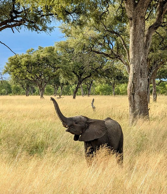 Am nächsten Morgen verflog die Müdigkeit schnell auf der ersten Pirschfahrt. Nach einer Stunde erblickten wir den ersten Elefanten – majestätisch und doch alltäglich in Hwange, wo bis zu 40’000 Tiere leben. Am Nachmittag folgten weitere Begegnungen mit den sanften Riesen. Besonders eindrücklich: die Jungtiere, die neugierig unsere Nähe bei einem Wasserloch suchten. Tags darauf begab ich mich auf eine Walking-Safari – ein eindrückliches Erlebnis, so hautnah den Puls der Wildnis zu spüren. Der anschliessende «Schwumm» im Pool der Lodge mit Blick aufs Wasserloch bot die verdiente Entspannung. Am Abend bestätigte sich der Spitzname des Hwange-Nationalparks als «Elefanten-Paradies» erneut. Perfekt zur Golden Hour durfte ich einer Elefantenfamilie beim Trinken und Spielen rund um ein Wasserloch zuschauen – einfach nur magisch!