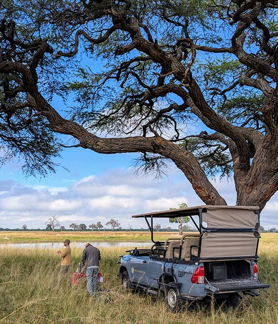 Bei den Stichwörtern «Afrika» und «Safari» denken viele an Tansania, Kenia oder Botswana. Dass Simbabwe und Sambia ebenso lohnende Ziele sind, durfte ich auf meiner Reise hautnah erleben – unendliche Weiten, faszinierende Tierbegegnungen und ein Abschluss am «donnernden Rauch» der Victoriafälle erwarteten mich. Bereits beim Anflug auf Victoria Falls zeigte sich die Schönheit Simbabwes. Nach einer langen Anreise inklusive eines spektakulären Flugs in einem Kleinflugzeug erreichte ich mein Camp im Hwange-Nationalpark. Herzlich empfangen, genoss ich das erste Abendessen am Lagerfeuer – und die unvergleichliche Stille des Busches zog mich direkt in ihren Bann.