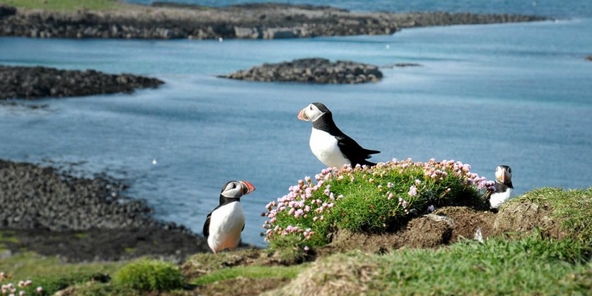 Gar nicht an Land gingen wir vor Skomer — dafür unternahmen wir eine abenteuerliche Erkundungsfahrt der Steilküste entlang im Zodiac-Schlauchboot. Vor Augen: ein Vogelparadies, das uns der holländische Vogelkundler, der unsere Gruppe begleitete, auf humorvolle Weise erläuterte. A propos Vögel: Ich habe mich verliebt. In die furchtlosen «Puffins». Den Papageitauchern, diesen drolligen, farbenfrohen Gesellen, kamen wir auf der schott ischen Isle of Lunga ganz nah. Tausende von ihnen leben auf der kleinen Insel. Neugierig posierten sie vor unseren Kameras, pickten danach, oder sie bastelten seelenruhig an ihren Nestern und liessen sich nicht stören.